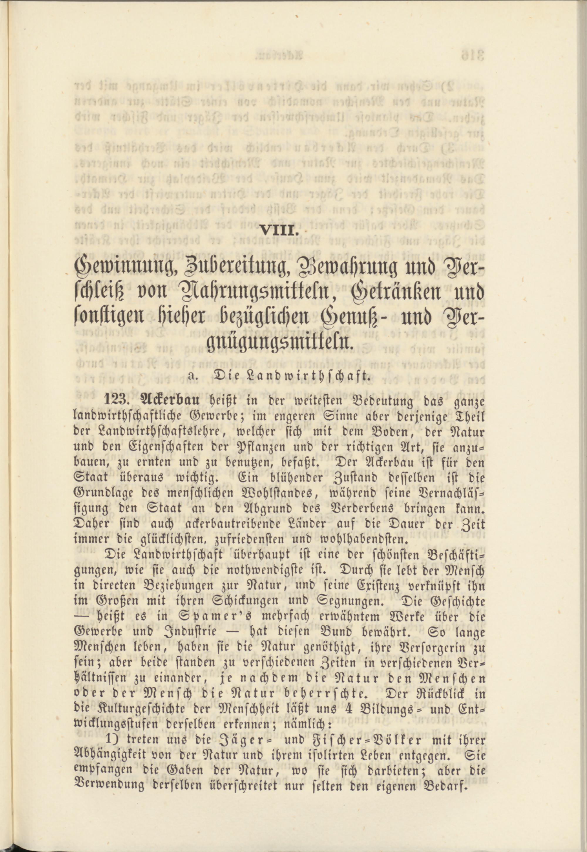 123. Ackerbau heißt in der weitesten Bedeutung das ganze landwirthschaftliche Gewerbe; im engeren Sinne aber derjenige Theil der Landwirthschaftslehre, welcher sich mit dem Boden, der Natur und den Eigenschaften der Pflanzen und der richtigen Art, sie anzubauen, zu ernten und zu benutzen, befaßt. Der Ackerbau ist für den Staat überaus wichtig. Ein blühender Zustand desselben ist die Grundlage des menschlichen Wohlstandes, während seine Vernachlässigung den Staat an den Abgrund des Verderbens bringen kann. Daher sind auch ackerbautreibende Länder auf die Dauer der Zeit immer die glücklichsten, zufriedensten und wohlhabendsten.