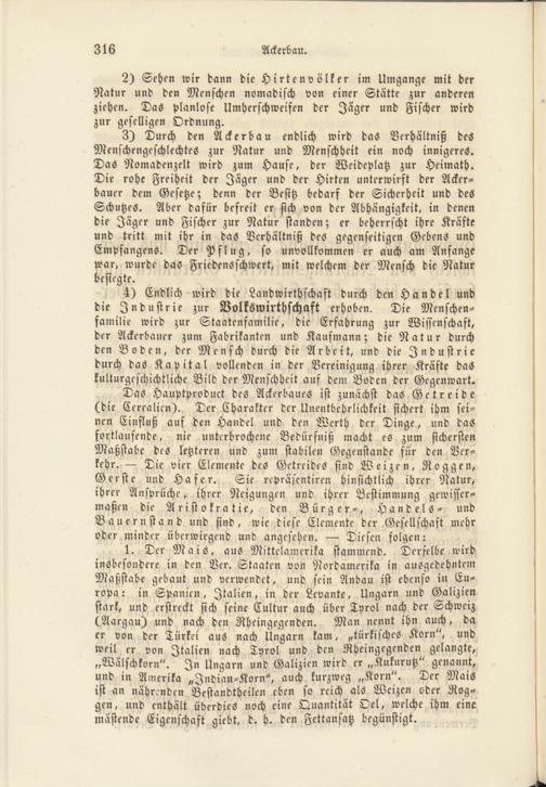 Das Hauptproduct des Ackerbaues ist zunächst das Getreide (die Cerealicn). Der Charakter der Unentbchrlichkeit sichert ihm seinen Einfluß auf den Handel und den Werth der Dinge, und das fortlaufende, nie unterbrochene Bedürfniß macht es zum sichersten Maßstabe des letzteren und zum stabilen Gegenstände für den Verkehr. — Die vier Elemente des Getreides sind Weizen, Roggen, Gerste und Hafer. Sie repräsentiern hinsichtlich ihrer Natur, ihrer Ansprüche, ihrer Neigungen und ihrer Bestimmung gewissermaßen die Aristokratie, den Bürger-, Handels- und Bauernstand und sind, wie diese Elemente der Gesellschaft mehr oder minder überwiegend und angesehen. — Diesen folgen: