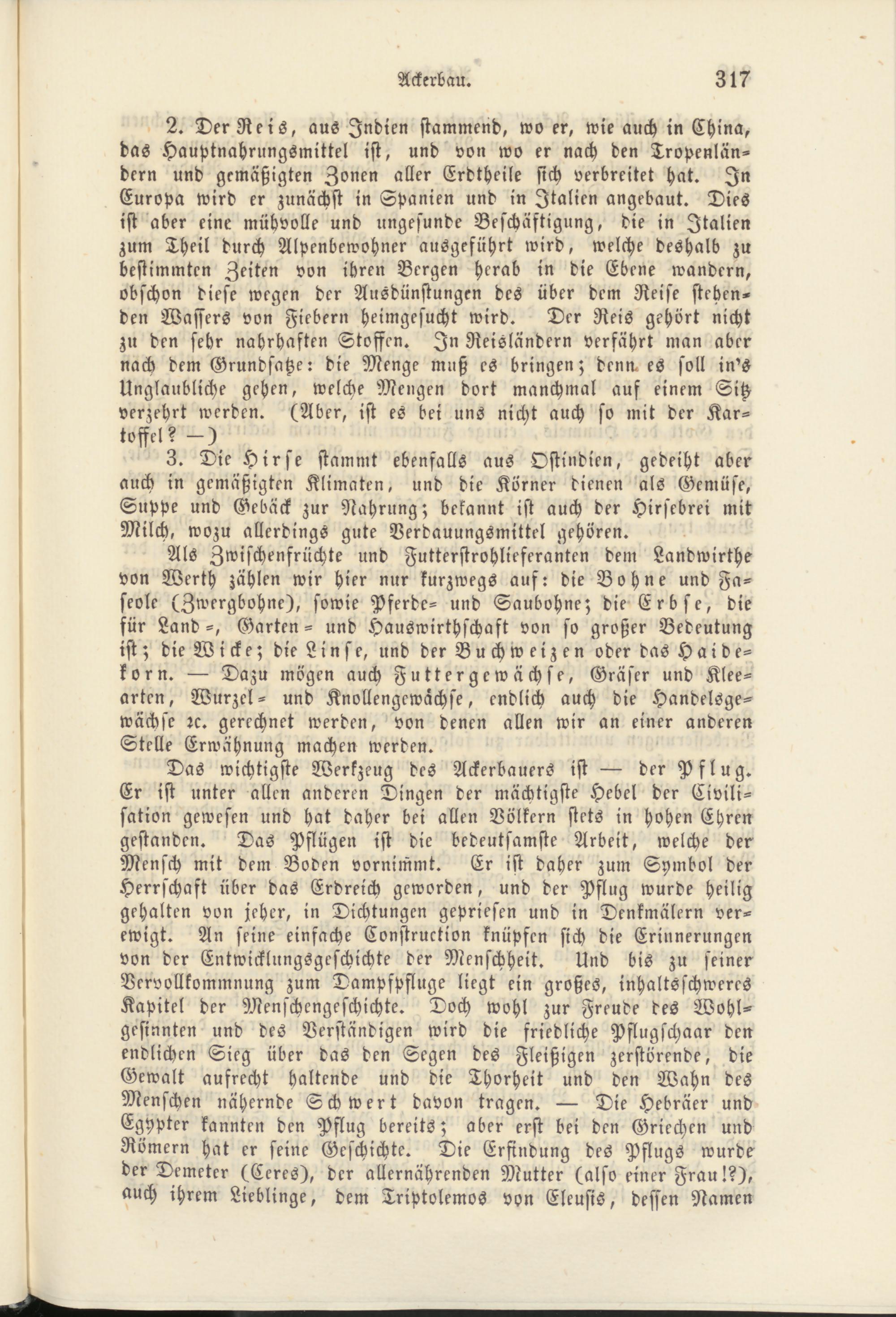 Das wichtigste Werkzeug des Ackerbauers ist der Pflug. Er ist unter allen anderen Dingen der mächtigste Hebel der Civili­sation gewesen und hat daher bei allen Völkern stets in hohen Ehren gestanden. Das Pflügen ist die bedeutsamste Arbeit, welche der Mensch mit dem Boden vornimmt. Er ist daher zum Symbol der Herrschaft über das Erdreich geworden, und der Pflug wurde heilig gehalten von jeher, in Dichtungen gepriesen und in Denkmälern ver­ewigt. An seine einfache Construction knüpfen sich die Erinnerungen von der Entwicklungsgeschichte der Menschheit. Und bis zu seiner Vervollkommnung zum Dampfpfluge liegt ein großes, inhaltsschweres Kapitel der Menschcngeschichte. Doch wohl zur Freude des Wohl­gesinnten und des Verständigen wird die friedliche Pflugschaar den endlichen Sieg über das den Segen des Fleißigen zerstörende, die Gewalt aufrecht haltende und die Thorheit und den Wahn des Menschen nähernde Schwert davon tragen. Die Hebräer und Egypter kannten den Pflug bereits; aber erst bei den Griechen und Römern hat er seine Geschichte. Die Erfindung des Pflugs wurde der Demeter (Ceres), der allernährenden Mutter (also einer Frau!?), auch ihrem Lieblinge, dem Triptolemos von Eleusis, dessen Namen