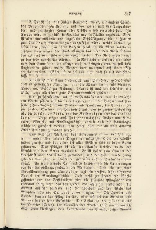 2. Der Reis, aus Indien stammend, wo er, wie auch in China, das Hauptnahrungsmittel ist, und von wo er nach den Tropenlän­dern und gemäßigten Zonen aller Erdtheile sich verbreitet hat. In Europa wird er zunächst in Spanien und in Italien angebaut. Dies ist aber eine mühvolle und ungesunde Beschäftigung, die in Italien zum Theil durch Alpenbewohner ausgeführt wird, welche deshalb zu bestimmten Zeiten von ihren Bergen herab in die Ebene wandern, obschon diese wegen der Ausdünstungen des über dem Reise stehen­den Wassers von Fiebern heimgesucht wird. Der Reis gehört nicht zu den sehr nahrhaften Stoffen. In Reisländern verfährt man aber nach dem Grundsätze: die Menge muß es bringen; denn. es soll in's Unglaubliche gehen, welche Mengen dort manchmal auf einem Sitz verzehrt werden. (Aber, ist es bei uns nicht auch so mit der Kar­toffel? -)