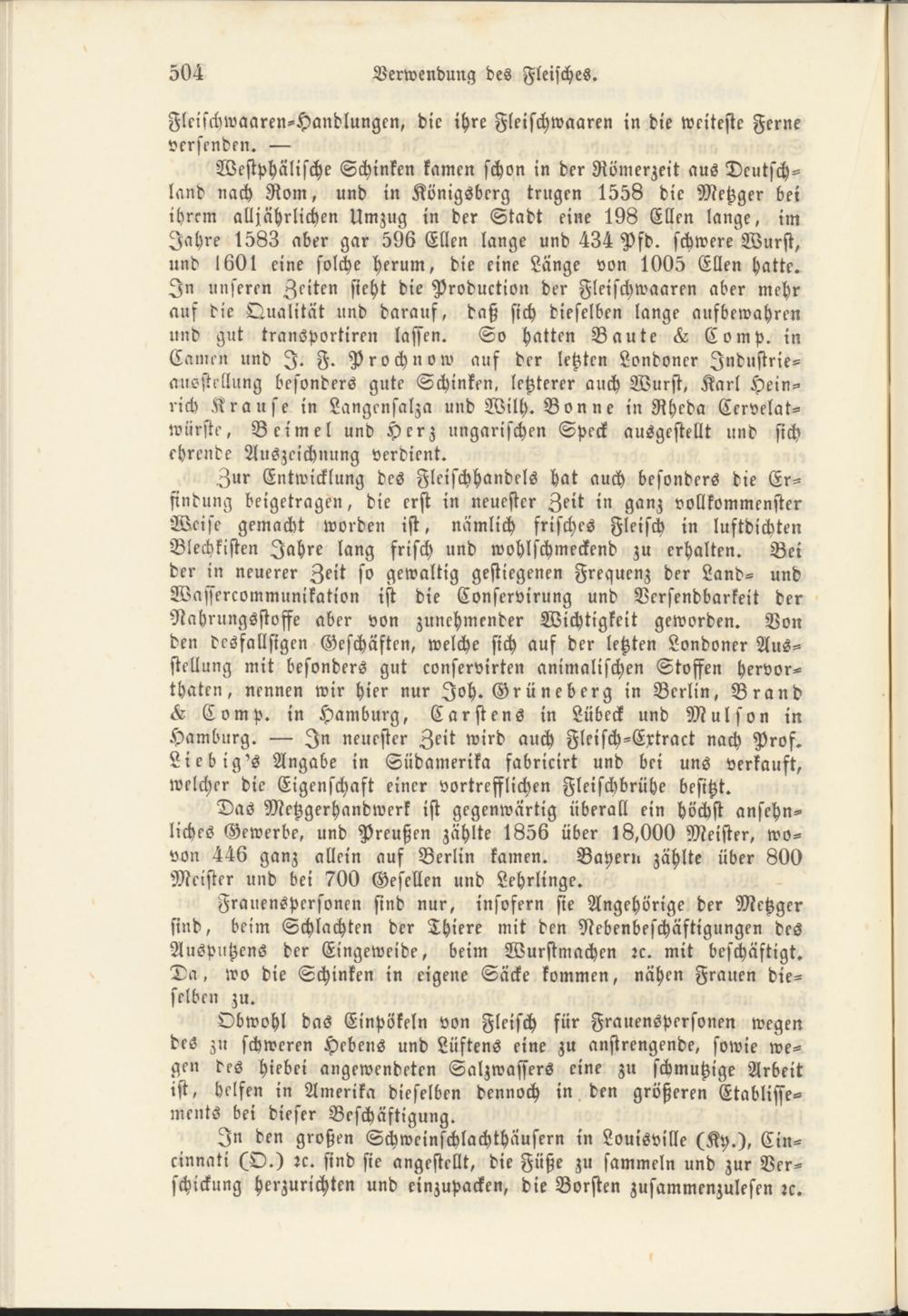 Zur Entwicklung des Fleischhandels hat auch besonders die Erfindung beigetragen, die erst in neuester Zeit in ganz vollkommenster Weise gemacht worden ist, nämlich frisches Fleisch in luftdichten Blechkisten Jahre lang frisch und wohlschmeckend zu erhalten. Bei der in neuerer Zeit so gewaltig gestiegenen Frequenz der Land- und Wassercommunikation ist die Conservirung und Verwendbarkeit der Nahrungsstoffe aber von zunehmender Wichtigkeit geworden. Von den tesfallsigen Geschäften, welche sich auf der letzten Londoner Ausstellung mit besonders gut conservirten animalischen Stoffen hervorthaten, nennen wir hier nur Joh. Grüneberg in Berlin, Brand L Comp. in Hamburg, Carstens in Lübeck und Mulson in Hamburg. — In neuester Zeit wird auch Flcisch-Extract nach Pros. Liebig's Angabe in Südamerika sabricirt und bei uns verkauft, welcher die Eigenschaft einer vortrefflichen Fleischbrühe besitzt.