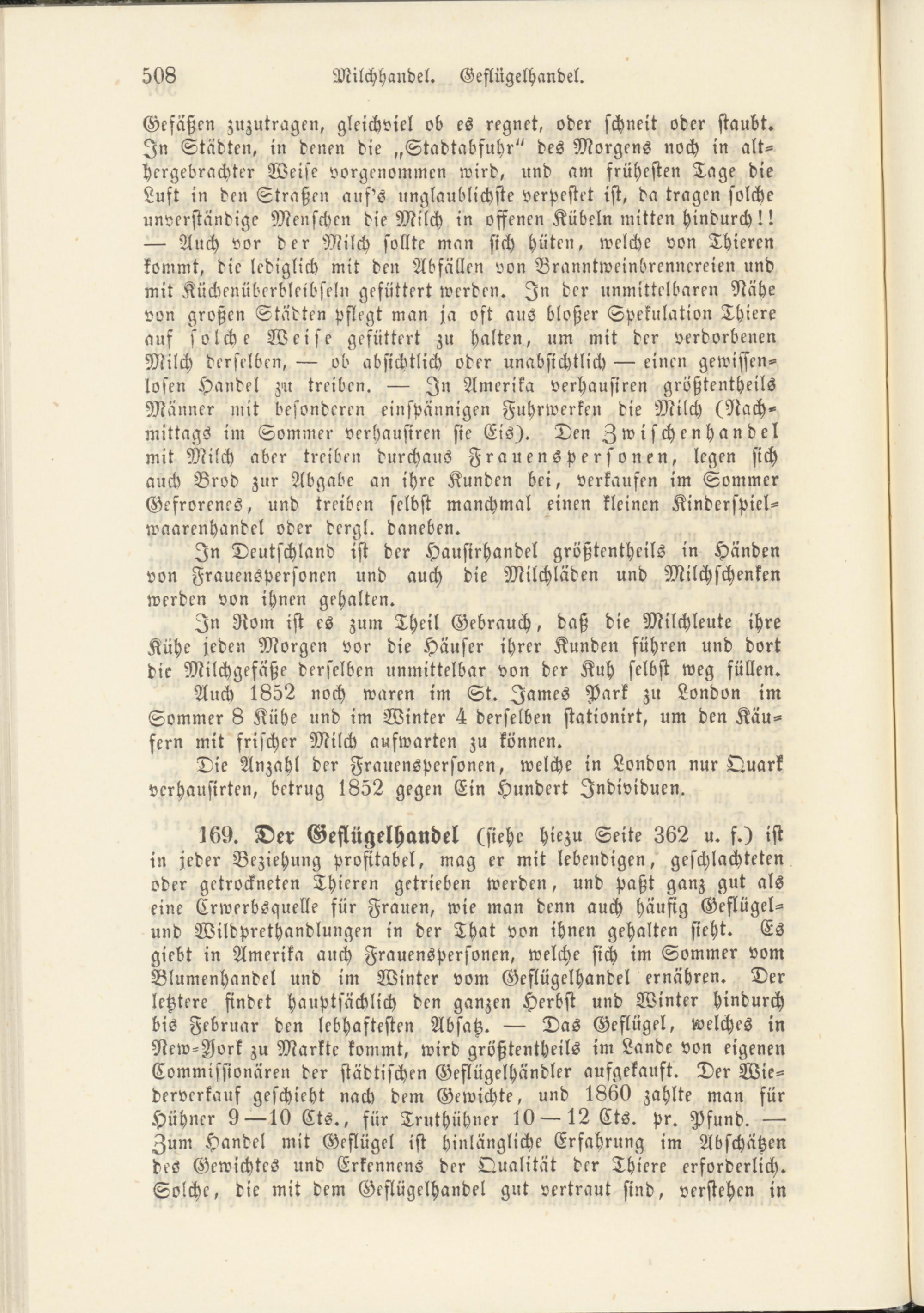 169. Der Geflügelhandel (siehe hiezu Seite 362 u. f.) ist in jeder Beziehung profitabel, mag er mit lebendigen, geschlachteten oder getrockneten Thieren getrieben werden, und paßt ganz gut als eine Erwerbsquelle für Frauen, wie man denn auch häufig Geflügel- und Wildprethandlungen in der That von ihnen gehalten sieht. Es giebt in Amerika auch Frauenspersonen, welche sich im Sommer vom Blumenhandel und im Winter vom Geflügelhandel ernähren. Der letztere findet hauptsächlich den ganzen Hkrbst und Winter hindurch bis Februar den lebhaftesten Absatz. Das Geflügel, welches in New-Iork zu Markte kommt, wird größtentheils im Lande von eigenen Commissionären der städtischen Geflügelhändler aufgekauft. Der Wie­derverkauf geschieht nach dem Gewichte, und 1860 zahlte man für Hühner 910 Cts., für Truthühner 1012 Cts. pr. Pfund. Zum Handel mit Geflügel ist hinlängliche Erfahrung im Abschätzen des Gewichtes und Erkennens der Qualität der Thiere erforderlich. Solche, die mit dem Gcflügelhandel gut vertraut sind, verstehen in