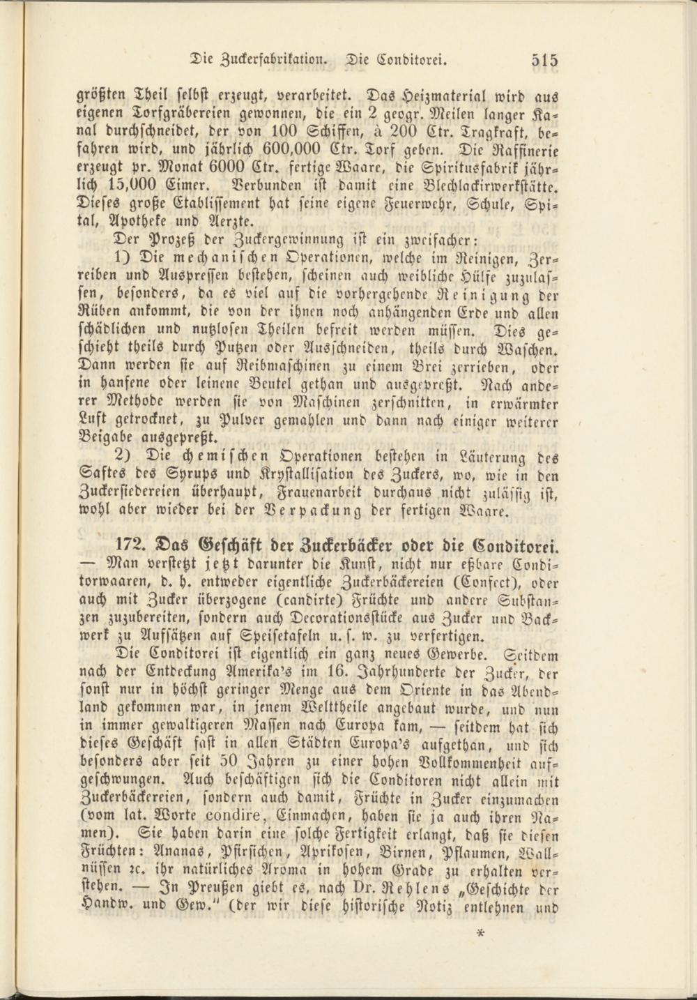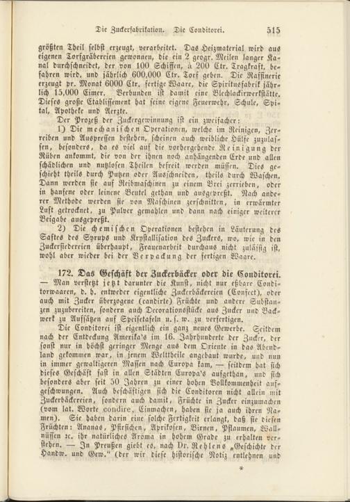 172. Das Geschäft der Zuckerbäcker oder die Conditorei. — Man versteht jetzt darunter die Kunst, nicht nur eßbare Condi- torwaaren, d. h. entweder eigentliche Zuckerbäckereien (Confect), oder auch mit Zucker überzogene (candirte) Früchte und andere Substanzen zuzubereiten, sondern auch Dekorationsstücke aus Zucker und Backwerk zu Aufsätzen auf Speisetafeln u. s. w. zu verfertigen.
