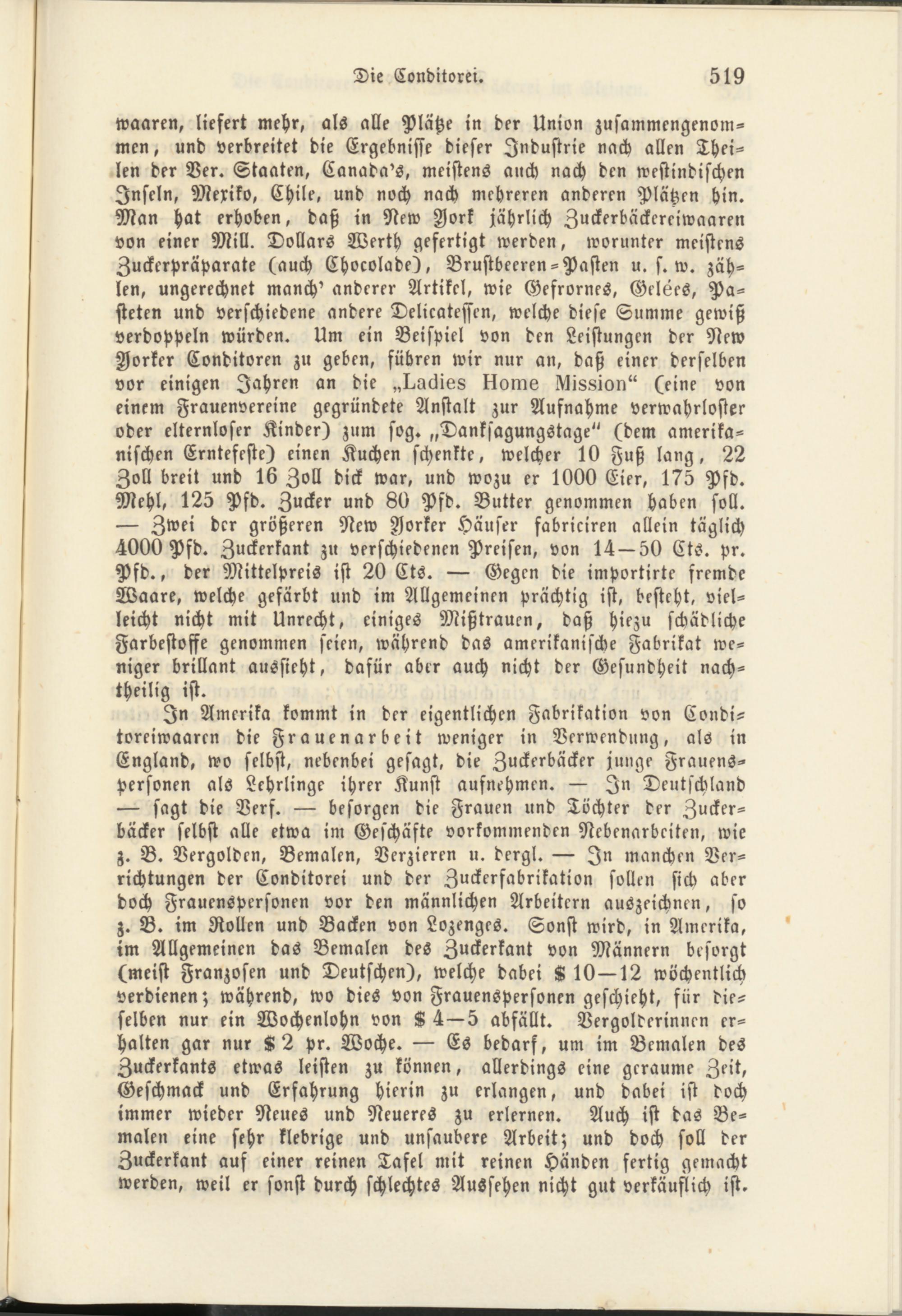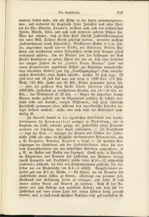 In Amerika kommt in der eigentlichen Fabrikation von Condi- toreiwaarcn die Frauenarbeit weniger in Verwendung, als in England, wo selbst, nebenbei gesagt, die Zuckerbäcker junge Frauenspersonen als Lehrlinge ihrer Kunst aufnehmen. — In Deutschland