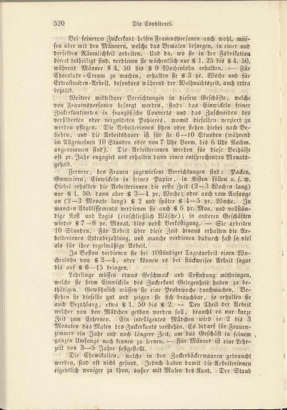 Weitere mittelbare Verrichtungen in diesem Geschäfte, welche von Frauenspersonen besorgt werden, sind: das Einwickeln feiner Zuckerkantsorten in französische Couvcrts und das Zuschneiden des versilberten oder vergoldeten Papieres, womit dieselben verziert zu werden pflegen. Die Arbeiterinnen sitzen oder stehen Hiebei nach Belieben, und die Arbeitsdauer ist für sie 6—10 Stunden (während im Allgemeinen 10 Stunden oder von 7 Uhr Vorm. bis 6 Uhr Nackm. angenommen sind). Die Arbeiterinnen werden für diese Beihülfe oft pr. Jahr engagirt und erhalten dann einen entsprechenden Monatsgehalt.