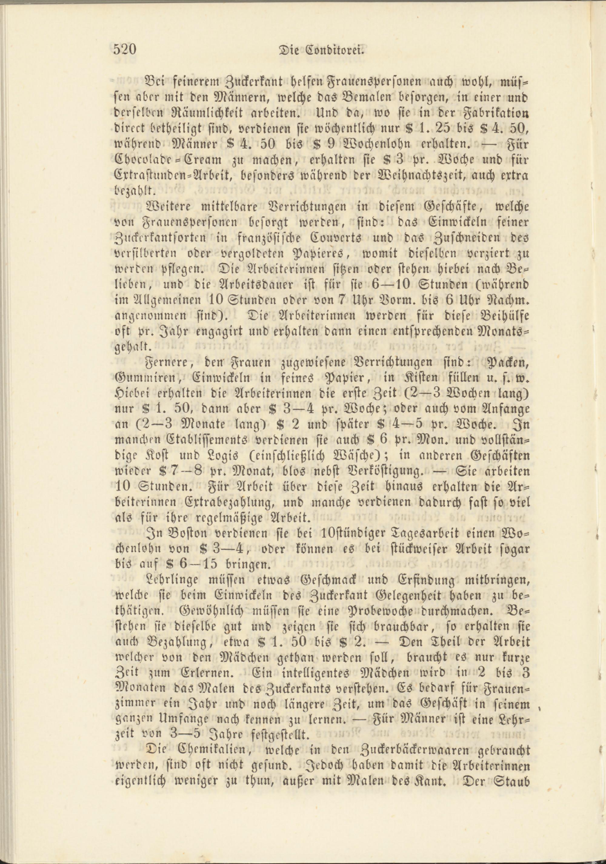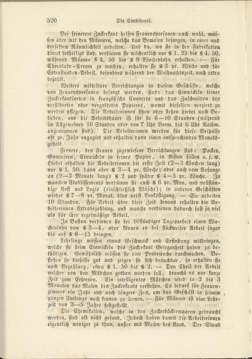 Bei feinerem Zuckcrkant helfen Frauenspersonen auch wohl, müssen aber mit den Männern, welche das Bemalen besorgen, in einer und derselben Räumlichkeit arbeiten. Und da, wo sie in der Fabrikation direet betheiligt sind, verdienen sie wöchentlich nur K 1. 25 bis 8 4. 50, während Männer 8 4. 50 bis 8 9 Wochenlohn erhalten. — Für Chocoladc--Cream zu machen, erhalten sie 8 3 Pr. Woche und für Extrastunden-Arbeit, besonders während der Weihnachtszeit, auch extra bezahlt.