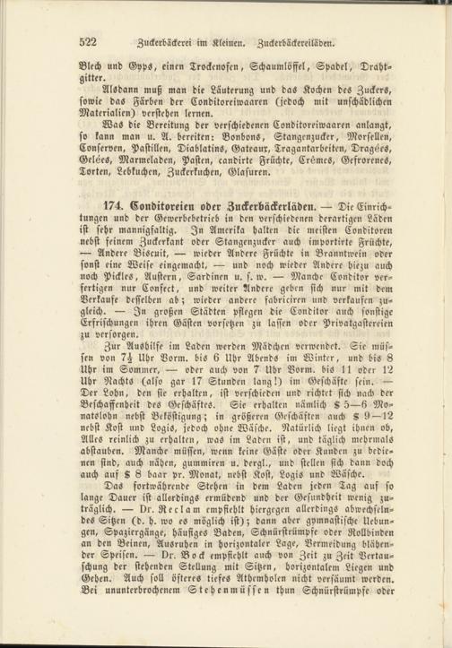 174. Conditoreien oder Zuckerbäckerläden. Die Einrich­tungen und der Gewerbebetrieb in den verschiedenen derartigen Läden ist sehr mannigfaltig. In Amerika halten die meisten Conditoren nebst feinem Zuckerkant oder Stangenzucker auch importirte Früchte, Andere Biscuit, wieder Andere Früchte in Branntwein oder sonst eine Weise eingemacht, und noch wieder Andere hiezu auch noch Pickles, Austern, Sardinen u. s. w. Manche Conditor ver­fertigen nur Confect, und weiter Andere geben sich nur mit dem Verkaufe desselben ab; wieder andere fabriciren und verkaufen zu­gleich. In großen Städten pflegen die Conditor auch sonstige Erfrischungen ihren Gästen vorsetzen zu lassen oder Privatgastcreien zu versorgen.