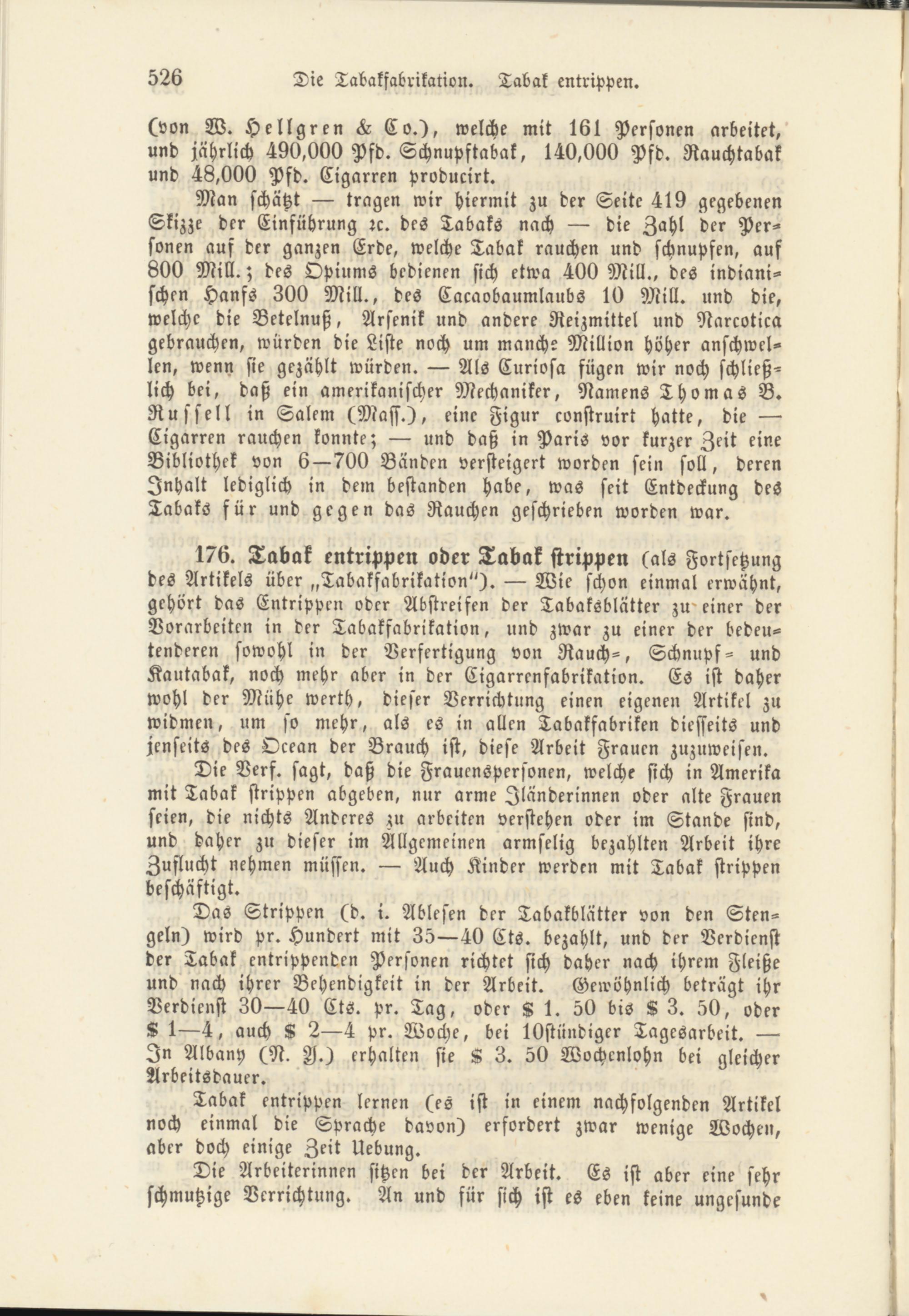 Die Derf. sagt, daß die Frauenspersonen, welche sich in Amerika mit Tabak strippen abgeben, nur arme Zländerinnen oder alte Frauen seien, die nichts Anderes zu arbeiten verstehen oder im Stande sind, und daher zu dieser im Allgemeinen armselig bezahlten Arbeit ihre Zuflucht nehmen müssen. Auch Kinder werden mit Tabak strippen beschäftigt.