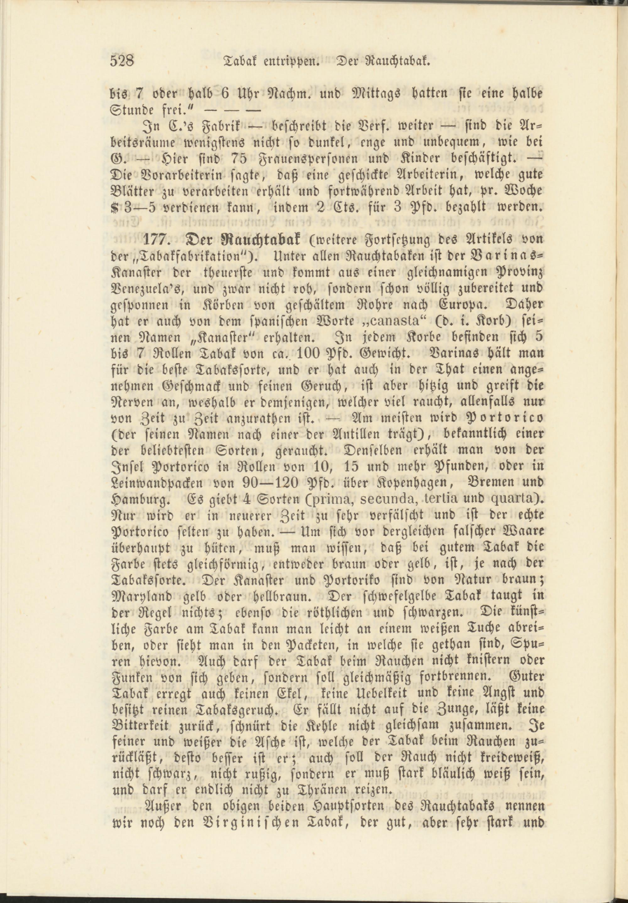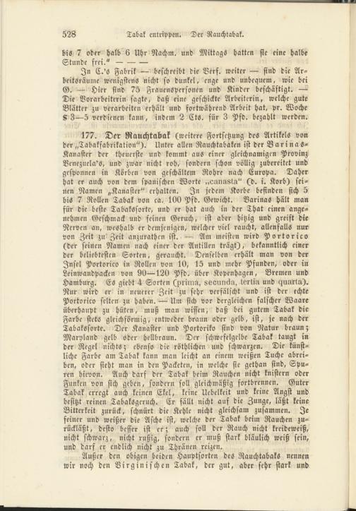 177. Der Rauchtabak (weitere Fortsetzung des Artikels von der „Tabakfabrikation"). Unter allen Rauchtabaken ist derVarina s- Kanaster der theuerste und kommt aus einer gleichnamigen Provinz Venezuela's, und zwar nicht roh, sondern schon völlig zubereitet und gesponnen in Körben von geschältem Rohre nach Europa. Daher hat er auch von dem spanischen Worte „eanu8ta" (d. i. Korb) seinen Namen „Kanaster" erhalten. In jedem Korbe befinden sich 5 bis 7 Rollen Tabak von ca. 100 Pfd. Gewicht. Varinas hält man für die beste Tabakssorte, und er hat auch in der That einen angenehmen Geschmack und feinen Geruch, ist aber hitzig und greift die Nerven an, weshalb er demjenigen, welcher viel raucht, allenfalls nur von Zeit zu Zeit anzurathen ist. — Am meisten wird Portorico (der seinen Namen nach einer der Antillen trägt), bekanntlich einer der beliebtesten Sorten, geraucht. Denselben erhält man von der Insel Portorico in Rollen von 10, 15 und mehr Pfunden, oder in Leinwandpacken von 90—120 Pfd. über Kopenhagen, Bremen und Hamburg. Es giebt 4 Sorten (primu, 866uncka, lertiu und Murtu). Nur wird er in neuerer Zeit zu sehr verfälscht und ist der echte Portorico selten zu haben. — Um sich vor dergleichen falscher Waare überhaupt zu hüten, muß man wissen, daß bei gutem Tabak die Farbe stets gleichförmig, entweder braun oder gelb, ist, je nach der Tabakssorte. Der Kanaster und Portoriko sind von Natur braun; Maryland gelb oder hellbraun. Der schwefelgelbe Tabak taugt in der Regel nichts; ebenso die röthlichen und schwarzen. Die künstliche Farbe am Tabak kann man leicht an einem weißen Tuche abreiben, oder sieht man in den Packeten, in welche sie gethan sind, Spuren hicvon. Auch darf der Tabak beim Rauchen nicht knistern oder Funken von sich geben, sondern soll gleichmäßig fortbrennen. Guter Tabak erregt auch keinen Ekel, keine Uebelkeit und keine Angst und besitzt reinen Tabaksgeruch. Er fällt nicht auf die Zunge, läßt keine Bitterkeit zurück, schnürt die Kehle nicht gleichsam zusammen. Je feiner und weißer die Asche ist, welche der Tabak beim Rauchen zurückläßt, desto besser ist er; auch soll der Rauch nicht kreideweiß, nicht schwarz, nicht rußig, sondern er muß stark bläulich weiß sein, und darf er endlich nicht zu Thränen reizen.