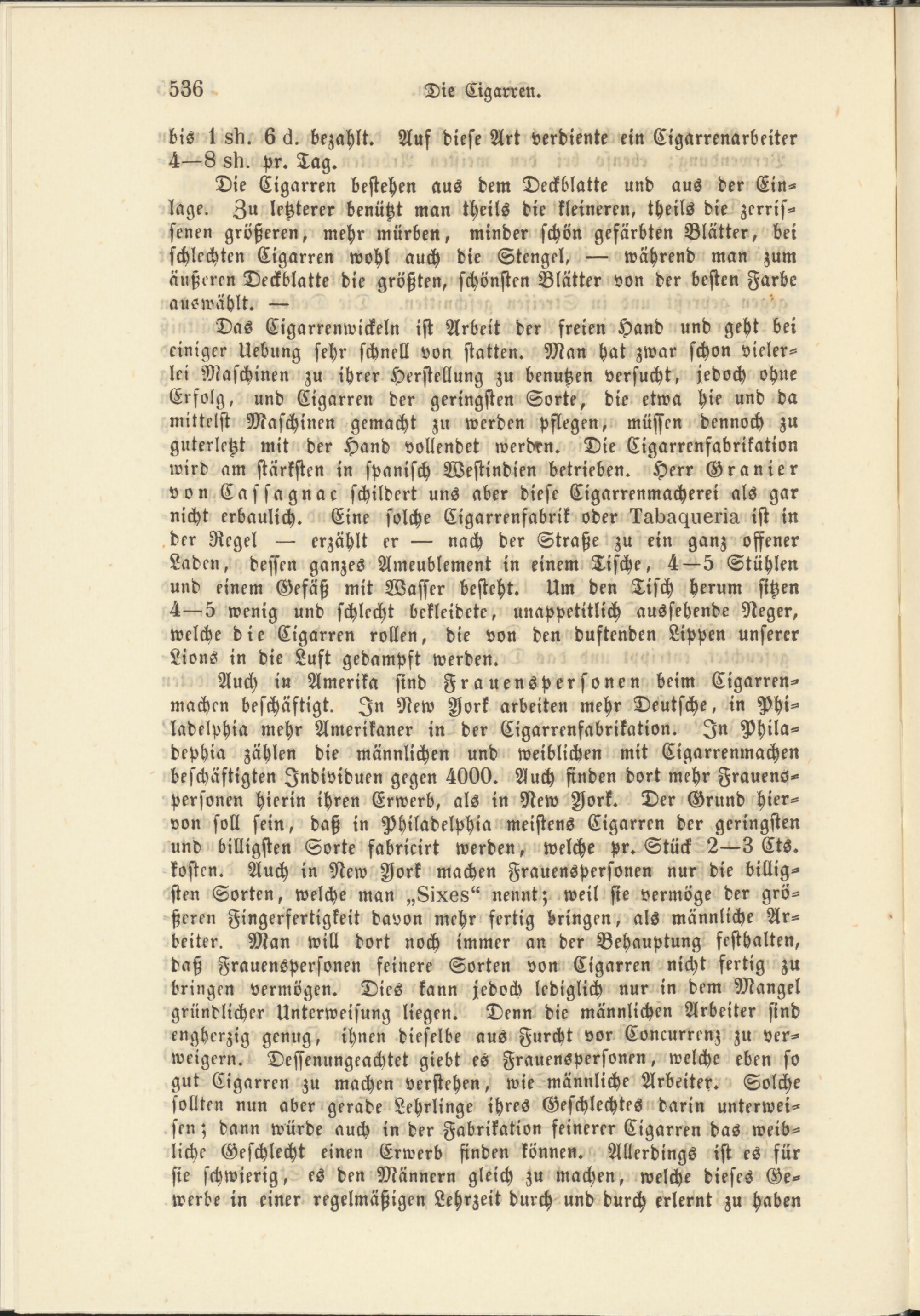 Das Cigarrenwickeln ist Arbeit der freien Hand und geht bei einiger Uebung sehr schnell von statten. Man hat zwar schon vielerlei Maschinen zu ihrer Herstellung zu benutzen versucht, jedoch ohne Erfolg, und Cigarren der geringsten Sorte, die etwa hie und da mittelst Maschinen gemacht zu werden pflegen, mästen dennoch zu guterletzt mit der Hand vollendet werden. Die Cigarrenfabrikation wird am stärksten in spanisch Westindien betrieben. Herr Granier von Cassagnac schildert uns aber diese Cigarrenmacherei als gar nicht erbaulich. Eine solche Cigarrenfabrik oder TukuHueria ist in der Regel — erzählt er — nach der Straße zu ein ganz offener Laden, dessen ganzes Ameublement in einem Tische, 4—5 Stühlen und einem Gefäß mit Wasser besteht. Um den Tisch herum sitzen 4—5 wenig und schlecht bekleidete, unappetitlich aussehende Neger, welche die Cigarren rollen, die von den duftenden Lippen unserer Lions in die Luft gedampft werden.