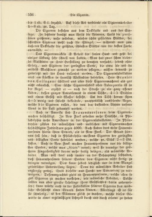Auch in Amerika stnd Frauenspersonen beim Cigarren- machen beschäftigt. In New Ijork arbeiten mehr Deutsche, in Philadelphia mehr Amerikaner in der Cigarrenfabrikation. In Phila- dephia zählen die männlichen und weiblichen mit Cigarrenmachen beschäftigten Individuen gegen 4000. Auch finden dort mehr Frauenspersonen hierin ihren Erwerb, als in New Jork. Der Grund hiervon soll sein, daß in Philadelphia meistens Cigarren der geringsten und billigsten Sorte fabricirt werden, welche pr. Stück 2—3 Cts. kosten. Auch in New Ijork machen Frauenspersonen nur die billigsten Sorten, welche man „8ix68" nennt; weil sie vermöge der größeren Fingerfertigkeit davon mehr fertig bringen, als männliche Arbeiter. Man will dort noch immer an der Behauptung festhalten, daß Frauenspersonen feinere Sorten von Cigarren nicht fertig zu bringen vermögen. Dies kann jedoch lediglich nur in dem Mangel gründlicher Unterweisung liegen. Denn die männlichen Arbeiter sind engherzig genug, ihnen dieselbe aus Furcht vor Concurrenz zu verweigern. Dessenungeachtet giebt es Frauenspersonen, welche eben so gut Cigarren zu machen verstehen, wie männliche Arbeiter. Solche >ol!ten nun aber gerade Lehrlinge ihres Geschlechtes darin unterweisen ; dann würde auch in der Fabrikation feinerer Cigarren das weibliche Geschlecht einen Erwerb finden können. Allerdings ist es für sie schwierig, es den Männern gleich zu machen, welche dieses Gewerbe in einer regelmäßigen Lehrzeit durch und durch erlernt zu haben