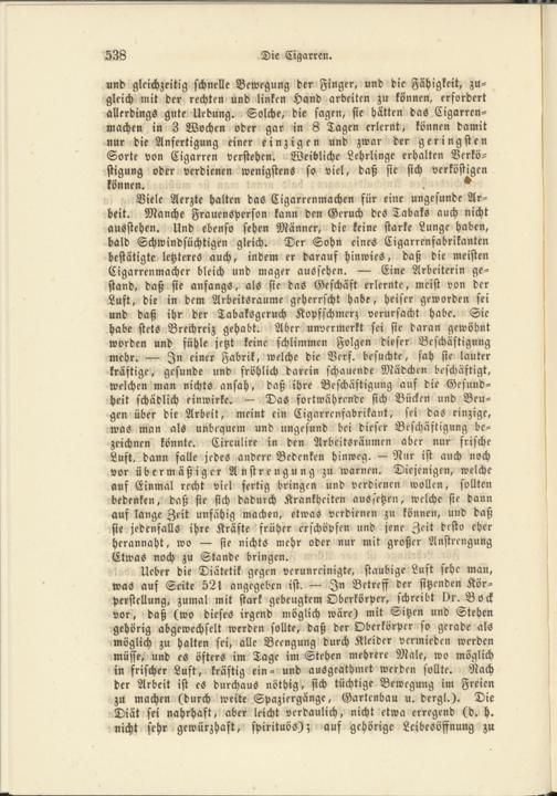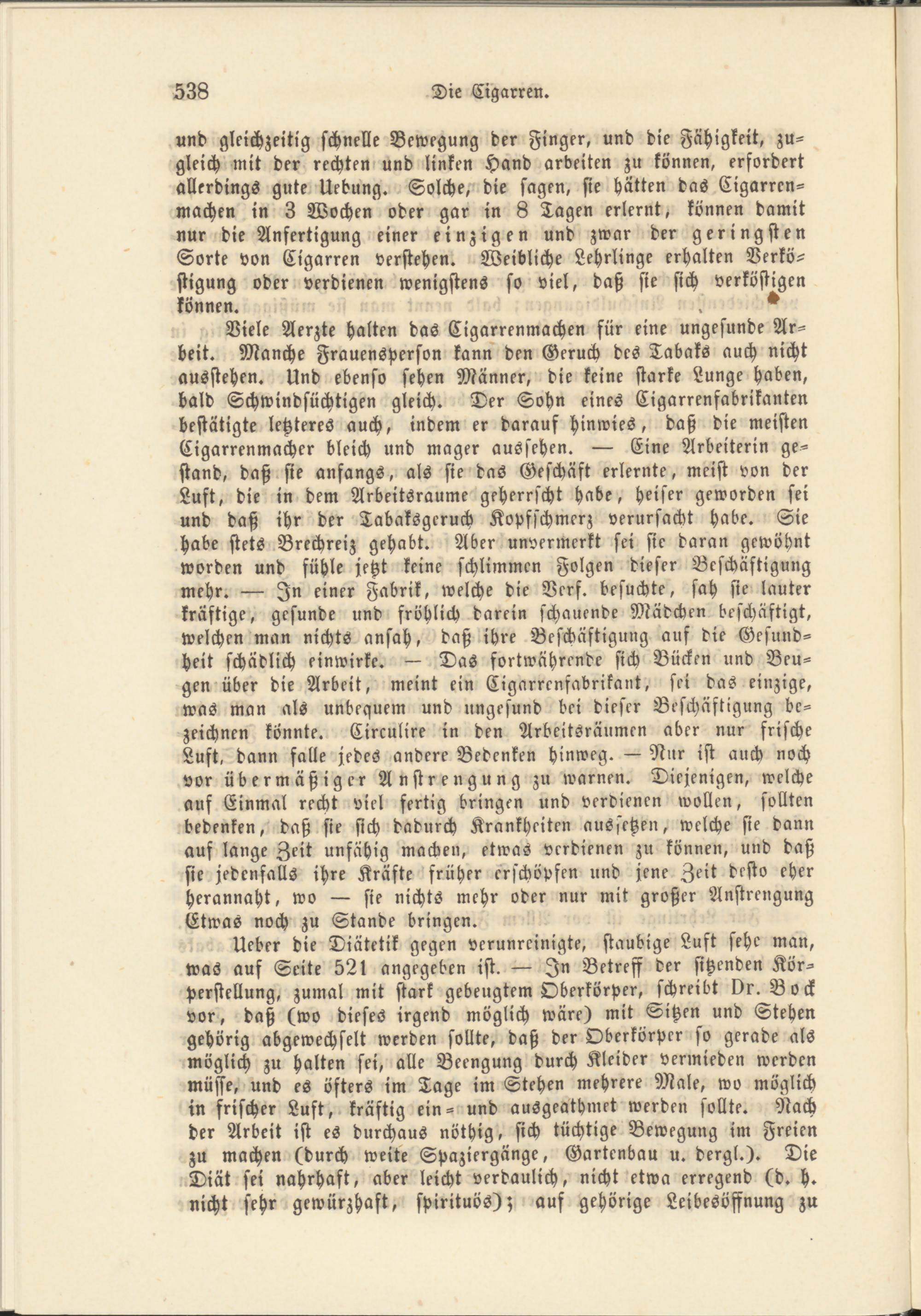 Viele Aerzte halten das Cigarrenmachen für eine ungesunde Ar­beit. Manche Frauensperson kann den Geruch des Tabaks auch nicht ausstehen. Und ebenso sehen Männer, die keine starke Lunge haben, bald Schwindsüchtigen gleich. Der Sohn eines Cigarrenfabrikanten bestätigte letzteres auch, indem er darauf hinwies, daß die meisten Cigarrenmacher bleich und mager aussehen. Eine Arbeiterin ge­stand, daß sie anfangs, als sie das Geschäft erlernte, meist von der Luft, die in dem Arbeitsraume geherrscht habe, heiser geworden sei und daß ihr der Tabaksgcruch Kopfschmerz verursacht habe. Sie habe stets Brechreiz gehabt. Aber unvermerkt sei sie daran gewöhnt worden und fühle jetzt keine schlimmen Folgen dieser Beschäftigung mehr. In einer Fabrik, welche die Verf. besuchte, sah sie lauter kräftige, gesunde und fröhlich darein schauende Mädchen beschäftigt, welchen man nichts ansah, daß ihre Beschäftigung auf die Gesund­heit schädlich einwirke. Das fortwährende sich Bücken und Beu­gen über die Arbeit, meint ein Cigarrcnfabrikant, sei das einzige, was man als unbequem und ungesund bei dieser Beschäftigung be­zeichnen könnte. Circulire in den Arbeitsräumen aber nur frische Luft, dann falle jedes andere Bedenken hinweg. Nur ist auch noch vor übermäßiger Anstrengung zu warnen. Diejenigen, welche auf Einmal recht viel fertig bringen und verdienen wollen, sollten bedenken, daß sie sich dadurch Krankheiten aussetzen, welche sie dann auf lange Zeit unfähig machen, etwas verdienen zu können, und daß sie jedenfalls ihre Kräfte früher erschöpfen und jene Zeit desto eher herannaht, wo sie nichts mehr oder nur mit großer Anstrengung Etwas noch zu Stande bringen.