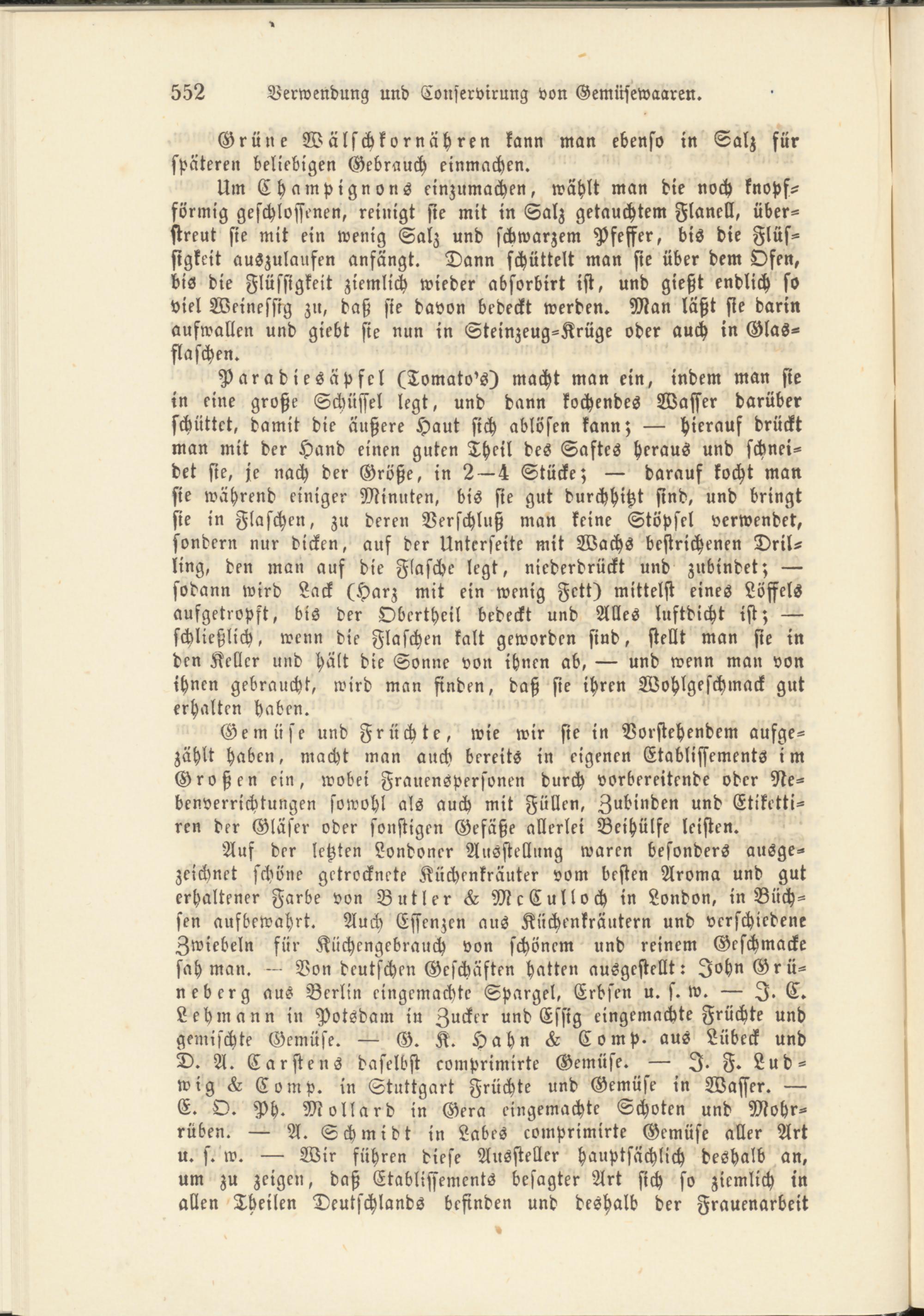 Auf der letzten Londoner Ausstellung waren besonders ausge­zeichnet schöne getrocknete Küchenkräuter vom besten Aroma und gut erhaltener Farbe von Butler L McCulloch in London, in Büch­sen aufbewahrt. Auch Essenzen aus Kiichenkräutern und verschiedene Zwiebeln für Küchengebrauch von schönem und reinem Geschmacke sah man. - Von deutschen Geschäften hatten ausgestellt: John Grü­neberg aus Berlin eingemachte Spargel, Erbsen u. s. w. I. C. Lehmann in Potsdam in Zucker und Essig eingemachte Früchte und gemischte Gemüse. G. K. Hahn «k Comp. aus Lübeck und