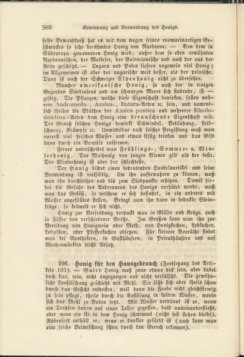 196. Honig für den Hausgebrauch (Fortsetzung des Artikels 195). — Guter Honig muß zwar etwas dick sein, aber dabei doch klar, rein, nicht angegangen und nicht verfälscht. Die gewöhnliche Verfälschung geschieht mit Mehl. Sie läßt sich aber theils schon durch das Gesicht entdecken, weil dann die Farbe nicht gleichförmig zu sein pflegt, theils durch die Auflösung in kaltem Wasser, worin sich das Mehl zu Boden setzt. Mit Wäger verdünnt ist er, wenn ein Tropfen davon auf einen Teller gegossen, bald auseinanderfließt, oder wenn ein Ei in dem Honig schwimmt (nicht fest stehen bleibt). Rübensaft enthält er, wenn er dunkler gefärbt ist (auch kann man eine solche Beimischung schon durch den Geruch erkennen).