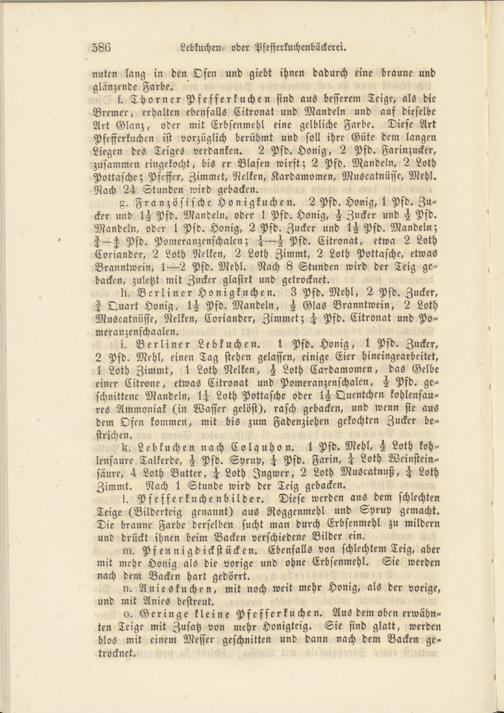 i. Berliner Lebkuchen. 1 Pfd. Honig, 1 Pfd. Zucker, 2 Pfd. Mehl, einen Tag stehen gelassen, einige Eier hineingearbeitet, 1 Loth Zimmt, 1 Loth Nelken, H Loth Cardamomen, das Gelbe einer Citrone, etwas Citronat und Pomeranzenschalen, H Pfd. geschnittene Mandeln, Loth Pottasche oder Quentchen kohlensaures Ammoniak (in Wasser gelöst), rasch gebacken, und wenn sie aus dem Ofen kommen, mit bis zum Fadenziehen gekochten Zucker be- strichen.