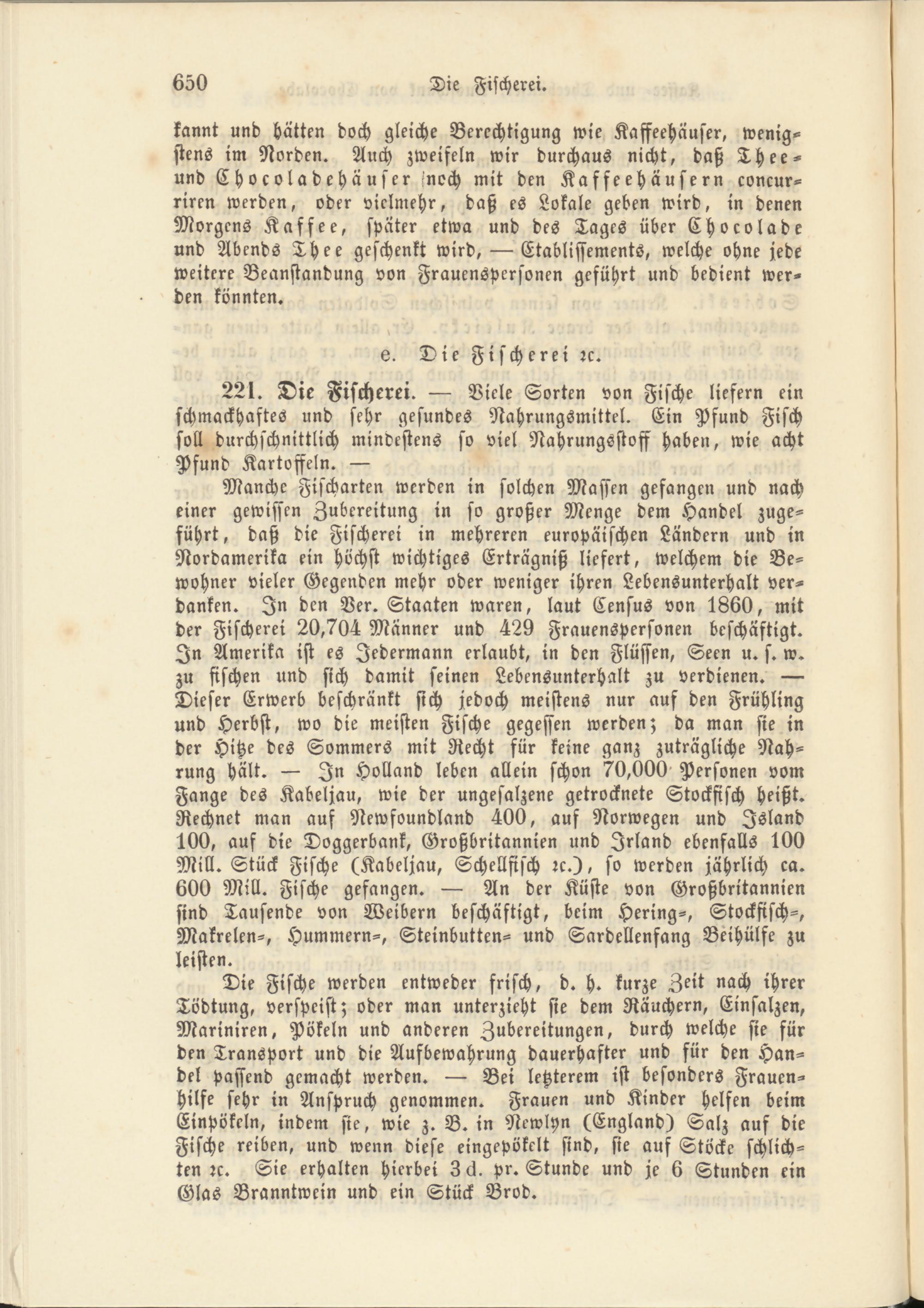 Manche Fischarten werden in solchen Massen gefangen und nach einer gewissen Zubereitung in so großer Menge dem Handel zugeführt, daß die Fischerei in mehreren europäischen Ländern und in Nordamerika ein höchst wichtiges Erträgniß liefert, welchem die Bewohner vieler Gegenden mehr oder weniger ihren Lebensunterhalt verdanken. In den Ver. Staaten waren, laut Census von 1860, mit der Fischerei 20,704 Männer und 429 Frauenspersonen beschäftigt. In Amerika ist es Jedermann erlaubt, in den Flüssen, Seen u. s. w. zu fischen und sich damit seinen Lebensunterhalt zu verdienen. — Dieser Erwerb beschränkt sich jedoch meistens nur auf den Frühling und Herbst, wo die meisten Fische gegessen werden; da man sie in der Hitze des Sommers mit Recht für keine ganz zuträgliche Nahrung hält. — In Holland leben allein schon 70,000 Personen vom Fange des Kabeljau, wie der ungesalzene getrocknete Stockfisch heißt. Rechnet man auf Newfoundland 400, auf Norwegen und Island 100, auf die Doggerbank, Großbritannien und Irland ebenfalls 100 Mill. Stück Fische (Kabeljau, Schellfisch rc.), so werden jährlich ca. 600 Mill. Fische gefangen. — An der Küste von Großbritannien sind Tausende von Weibern beschäftigt, beim Hering-, Stockfisch-, Makrelen-, Hummern-, Steinbutten- und Sardellenfang Beihülfe zu leisten.