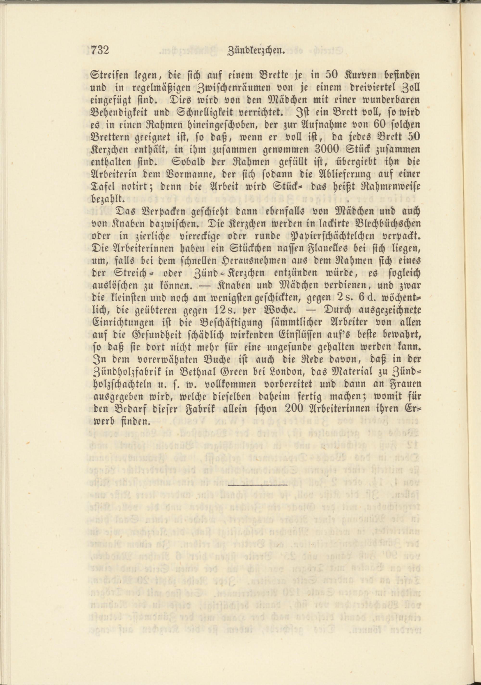 Das Verpacken geschieht dann ebenfalls von Mädchen und auch von Knaben dazwischen. Die Kerzchen werden in lackirte Blechbüchschen oder in zierliche viereckige oder runde Papierschächtelchen verpackt. Die Arbeiterinnen haben ein Stückchen nassen Flanelles bei sich liegen, um, falls bei dem schnellen Herausnehmen aus dem Rahmen sich eines der Streich- oder Zünd-Kerzchen entzünden würde, es sogleich auslöschen zu können. — Knaben und Mädchen verdienen, und zwar die kleinsten und noch am wenigsten geschickten, gegen 28. 66. wöchentlich, die geübteren gegen 128. Per Woche. — Durch ausgezeichnete Einrichtungen ist die Beschäftigung sämmtlicher Arbeiter von allen auf die Gesundheit schädlich wirkenden Einflüssen auf's beste bewahrt, so daß sie dort nicht mehr für eine ungesunde gehalten werden kann. In dem vorerwähnten Buche ist auch die Rede davon, daß in der Zündholzfabrik in Bethnal Green bei London, das Material zu Zündholzschachteln u. s. w. vollkommen vorbereitet und dann an Frauen ausgegeben wird, welche dieselben daheim fertig machen; womit für den Bedarf dieser Fabrik allein schon 200 Arbeiterinnen ihren Erwerb finden.