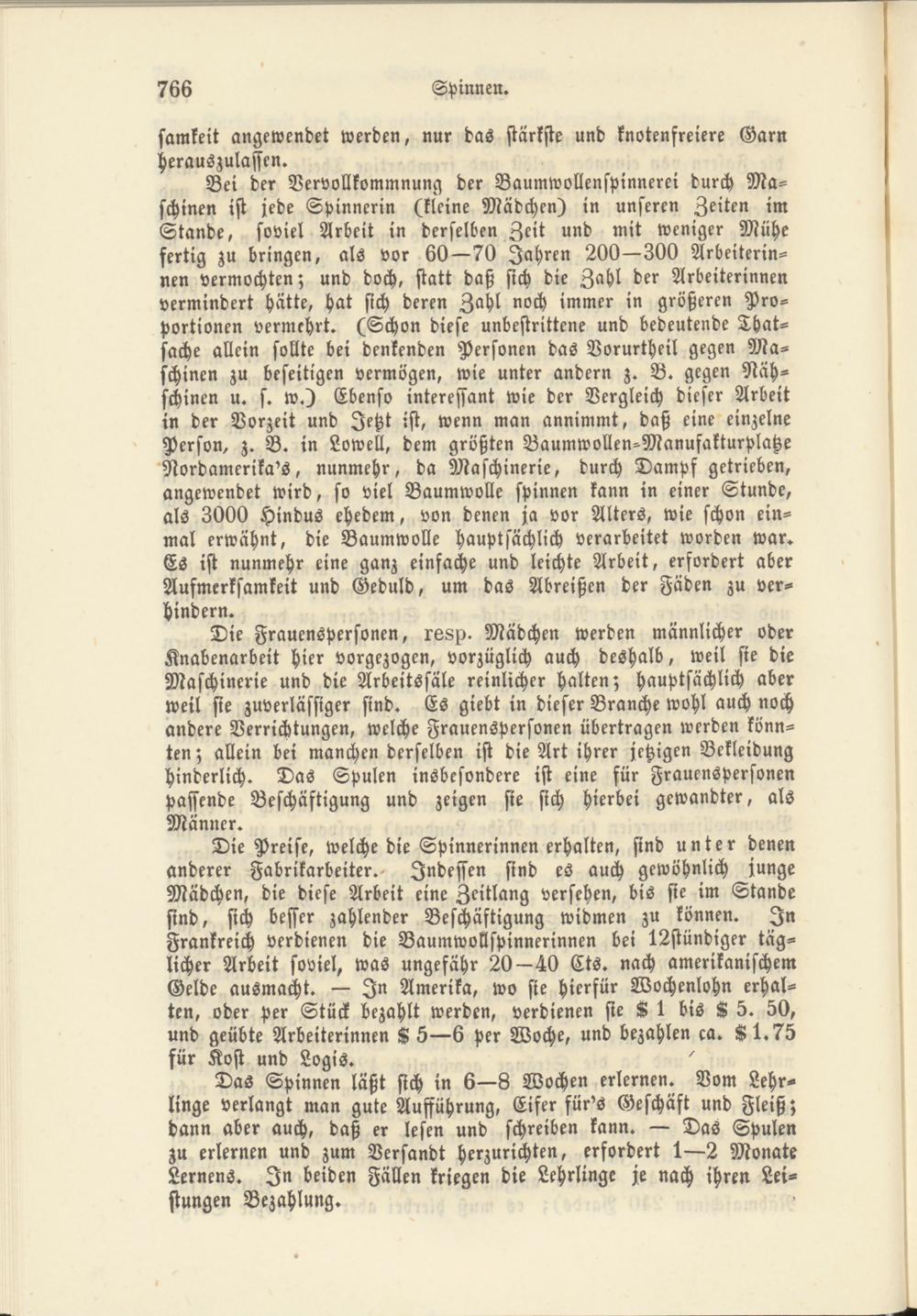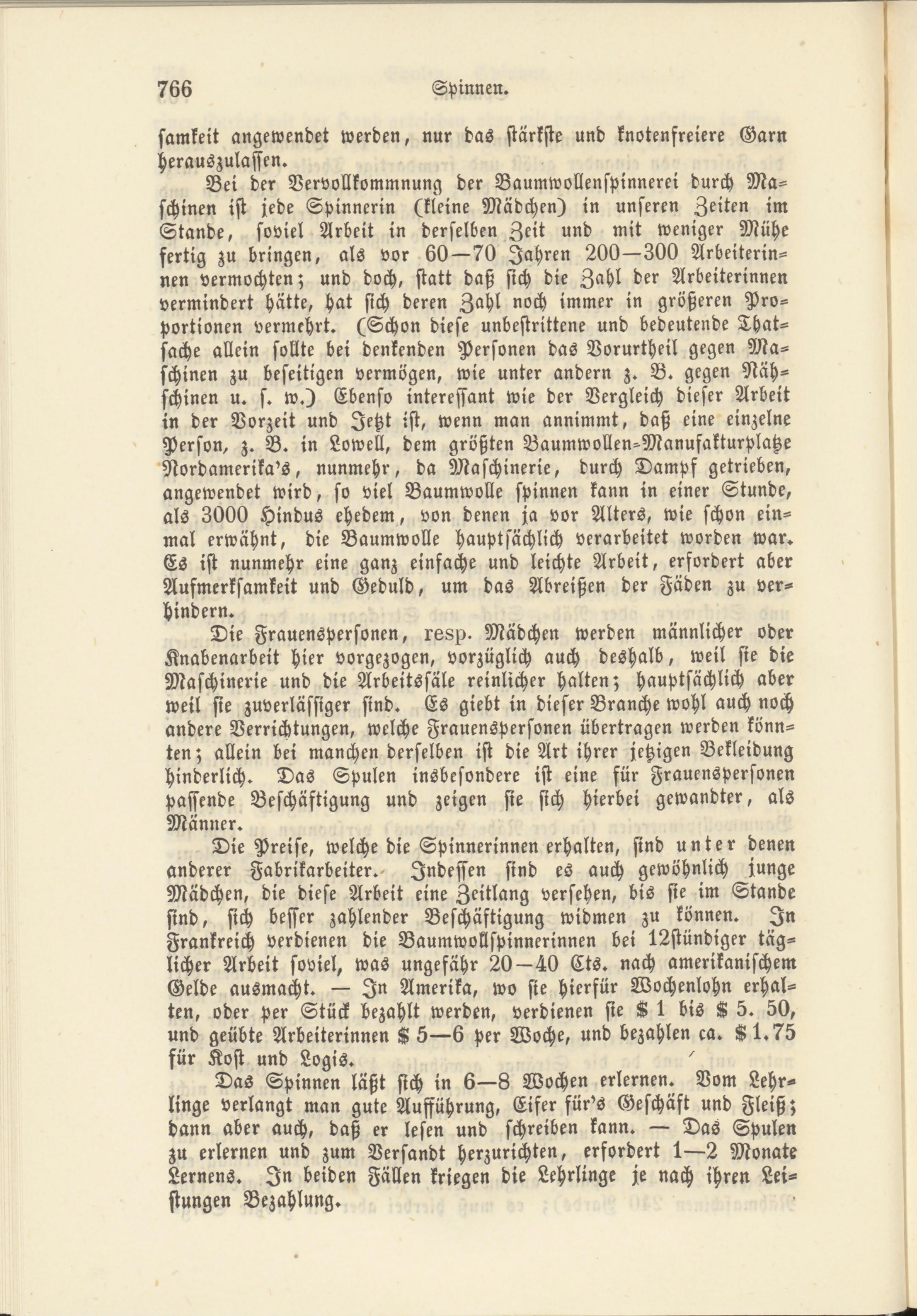 Bei der Vervollkommnung der Baumwollenspinnerei durch Maschinen ist jede Spinnerin (kleine Mädchen) in unseren Zeiten im Stande, soviel Arbeit in derselben Zeit und mit weniger Mühe fertig zu bringen, als vor 60—70 Jahren 200—300 Arbeiterinnen vermochten; und doch, statt daß sich die Zahl der Arbeiterinnen vermindert hätte, hat sich deren Zahl noch immer in größeren Proportionen vermehrt. (Schon diese unbestrittene und bedeutende Thatsache allein sollte bei denkenden Personen das Vorurtheil gegen Maschinen zu beseitigen vermögen, wie unter andern z. B. gegen Näh- schinen u. s. w.) Ebenso interessant wie der Vergleich dieser Arbeit in der Vorzeit und Jetzt ist, wenn man annimmt, daß eine einzelne Person, z. B. in Lowell, dem größten Baumwollen-Manufakturplatze Nordamerikas, nunmehr, da Maschinerie, durch Dampf getrieben, angewendet wird, so viel Baumwolle spinnen kann in einer Stunde, als 3000 Hindus ehedem, von denen ja vor Alters, wie schon einmal erwähnt, die Baumwolle hauptsächlich verarbeitet worden war. Es ist nunmehr eine ganz einfache und leichte Arbeit, erfordert aber Aufmerksamkeit und Geduld, um das Abreißen der Fäden zu verhindern.