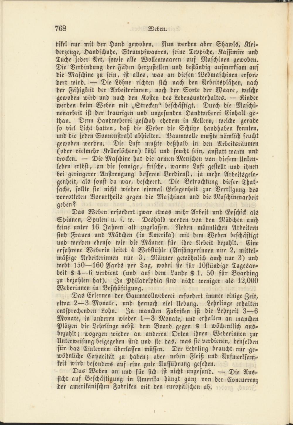 tikel nur mit der Hand gewoben. Nun werden aber Shawls, Kleiderzeuge, Handschuhe, Strumpfwaaren, feine Teppiche, Kassimire und Tuche jeder Art, sowie alle Wollenwaaren auf Maschinen gewoben. Die Verbindung der Fäden herzustellen und beständig aufmerksam auf die Maschine zu sein, ist alles, was an diesen Webmaschinen erfordert wird. — Die Löhne richten sich nach den Arbeitsplätzen, nach der Fähigkeit der Arbeiterinnen, nach der Sorte der Waare, welche gewoben wird und nach den Kosten des Lebensunterhaltes. — Kinder werden beim Weben mit „Strecken" beschäftigt. Durch die Maschinenarbeit ist der traurigen und ungesunden Handweberei Einhalt gethan. Denn Handweberei geschah ehedem in Kellern, welche gerade so viel Licht hatten, daß die Weber die Schütze handhaben konnten, und die jeden Sonnenstrahl abhielten. Baumwolle mußte nämlich feucht gewoben werden. Die Luft mußte deßhalb in den Arbeitsräumen (oder vielmehr Kellerlöchern) kühl und feucht sein, anstatt warm und trocken. — Die Maschine hat die armen Menschen von diesem Unken- leben erlöst, an die sonnige, frische, warme Luft gestellt und ihnen bei geringerer Anstrengung besseren Verdienst, ja mehr Arbeitsgelegenheit, als sonst da war, bescheert. Die Betrachtung dieser Thatsache, sollte sie nicht wieder einmal Gelegenheit zur Vertilgung des Verrotteten Vorurtheils gegen die Maschinen und die Maschinenarbeit geben?