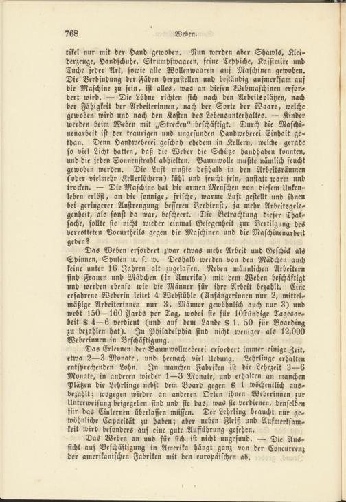 Das Weben erfordert zwar etwas mehr Arbeit und Geschick als Spinnen, Spulen u. s. w. Deshalb werden von den Mädchen auch keine unter 16 Jahren alt zugelassen. Neben männlichen Arbeitern sind Frauen und Mädchen (in Amerika) mit dem Weben beschäftigt und werden ebenso wie die Männer für ihre Arbeit bezahlt. Eine erfahrene Weberin leitet 4 Webstühle (Anfängerinnen nur 2, mittelmäßige Arbeiterinnen nur 3, Männer gewöhnlich auch nur 3) und webt 150—160 Jards Per Tag, wobei sie für lOstündige Tagesarbeit K 4—6 verdient (und auf dem Lande K 1. 50 für Boarding zu bezahlen hat). In Philadelphia sind nicht weniger als 12,000 Weberinnen in Beschäftigung.
