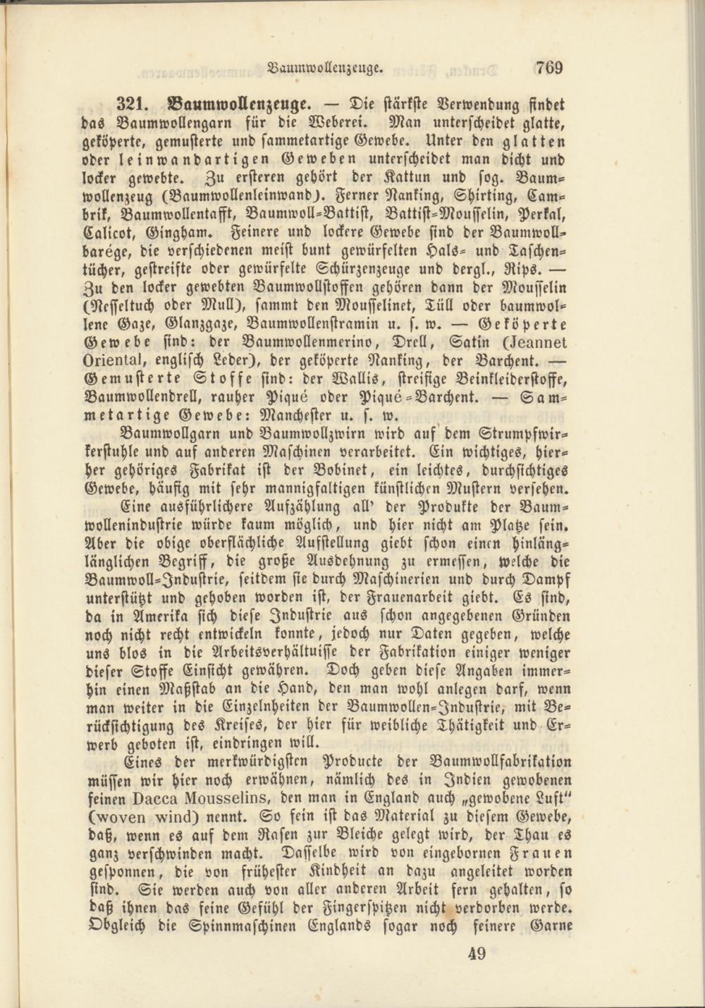 321. Baumwollenzeuge. — Die stärkste Verwendung findet das Baumwollengarn für die Weberei. Man unterscheidet glatte, geköperte, gemusterte und sammetartige Gewebe. Unter den glatten oder leinwandartigen Geweben unterscheidet man dicht und locker gewebte. Zu ersteren gehört der Kattun und sog. Baumwollenzeug (Baumwollenleinwand). Ferner Nanking, Shirting, Cam- brik, Baumwollentafft, Baumwoll-Battist, Battist-Moufselin, Perkal, Calicot, Gingham. Feinere und lockere Gewebe sind der Baumwoll- barege, die verschiedenen meist bunt gewürfelten Hals- und Taschentücher, gestreifte oder gewürfelte Schürzenzeuge und dergl., Rips. — Zu den locker gewebten Baumwollstoffen gehören dann der Mousselin (Ncffeltuch oder Mull), sammt den Mouffelinet, Tüll oder baumwollene Gaze, Glanzgaze, Baumwollenstramin u. s. w. — Geköperte Gewebe sind: der Baumwollenmerino, Drell, Satin (lennnet, Orienwl, englisch Leder), der geköperte Nanking, der Barchent. — Gemusterte Stoffe sind: der Wallis, streifige Beinkleiderstoffe, Baumwollendrell, rauher Pique oder Pique-Barchent. — Sammetartige Gewebe: Manchester u. s. w.