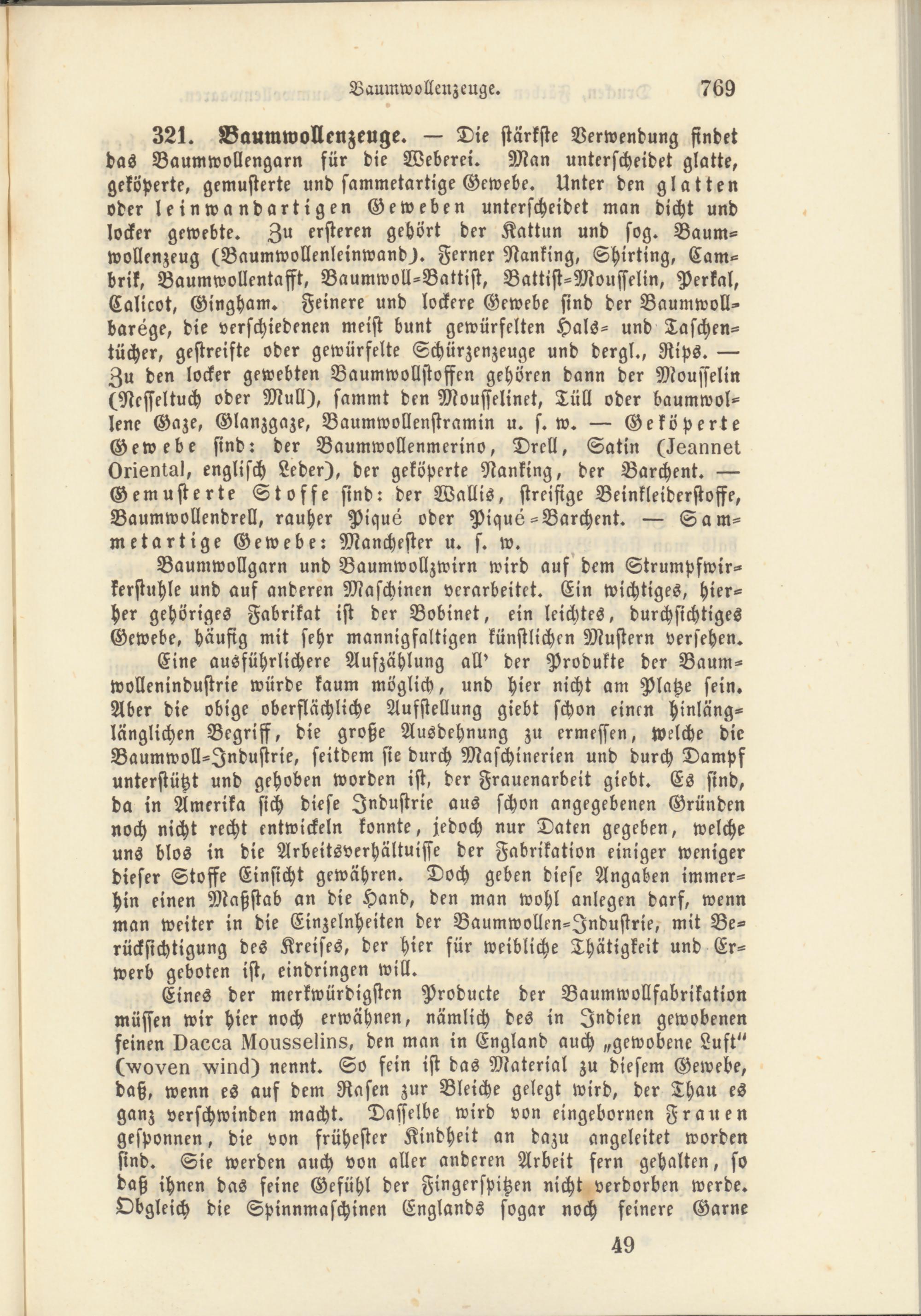 Eine ausführlichere Aufzählung all' der Produkte der Baum- wollenindustrie würde kaum möglich, und hier nicht am Platze sein. Aber die obige oberflächliche Aufstellung giebt schon einen hinläng- länglichen Begriff, die große Ausdehnung zu ermessen, welche die Baumwoll-Jndustrie, seitdem sie durch Maschinerien und durch Dampf unterstützt und gehoben worden ist, der Frauenarbeit giebt. Es sind, da in Amerika sich diese Industrie aus schon angegebenen Gründen noch nicht recht entwickeln konnte, jedoch nur Daten gegeben, welche uns blos in die Arbeitsverhältuisse der Fabrikation einiger weniger dieser Stoffe Einsicht gewähren. Doch geben diese Angaben immerhin einen Maßstab an die Hand, den man wohl anlegen darf, wenn man weiter in die Einzelnheiten der Baumwollen-Jndustrie, mit Berücksichtigung des Kreises, der hier für weibliche Thätigkeit und Erwerb geboten ist, eindringen will.