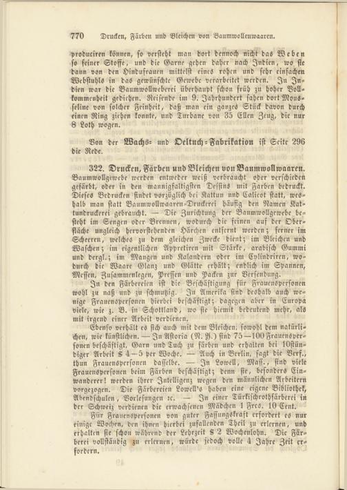 In den Färbereien ist die Beschäftigung für Frauenspersonen wohl zu naß und zu schmutzig. In Amerika sind deshalb auch wenige Frauenspersonen hierbei beschäftigt; dagegen aber in Europa viele, wie z. B. in Schottland, wo sie hiemit bedeutend mehr, als mit irgend einer Arbeit verdienen.