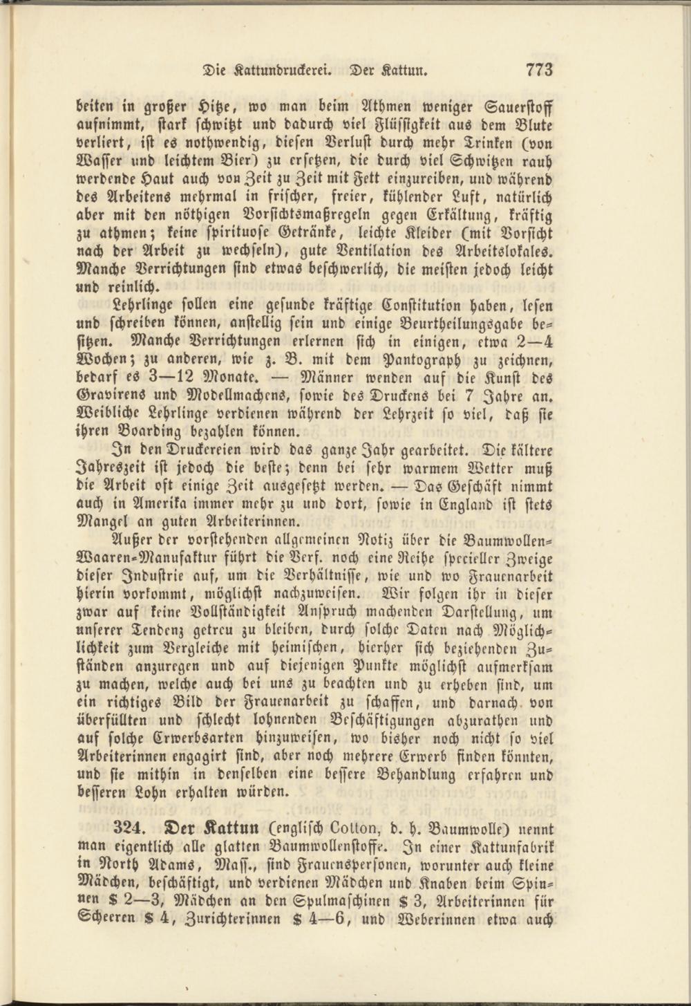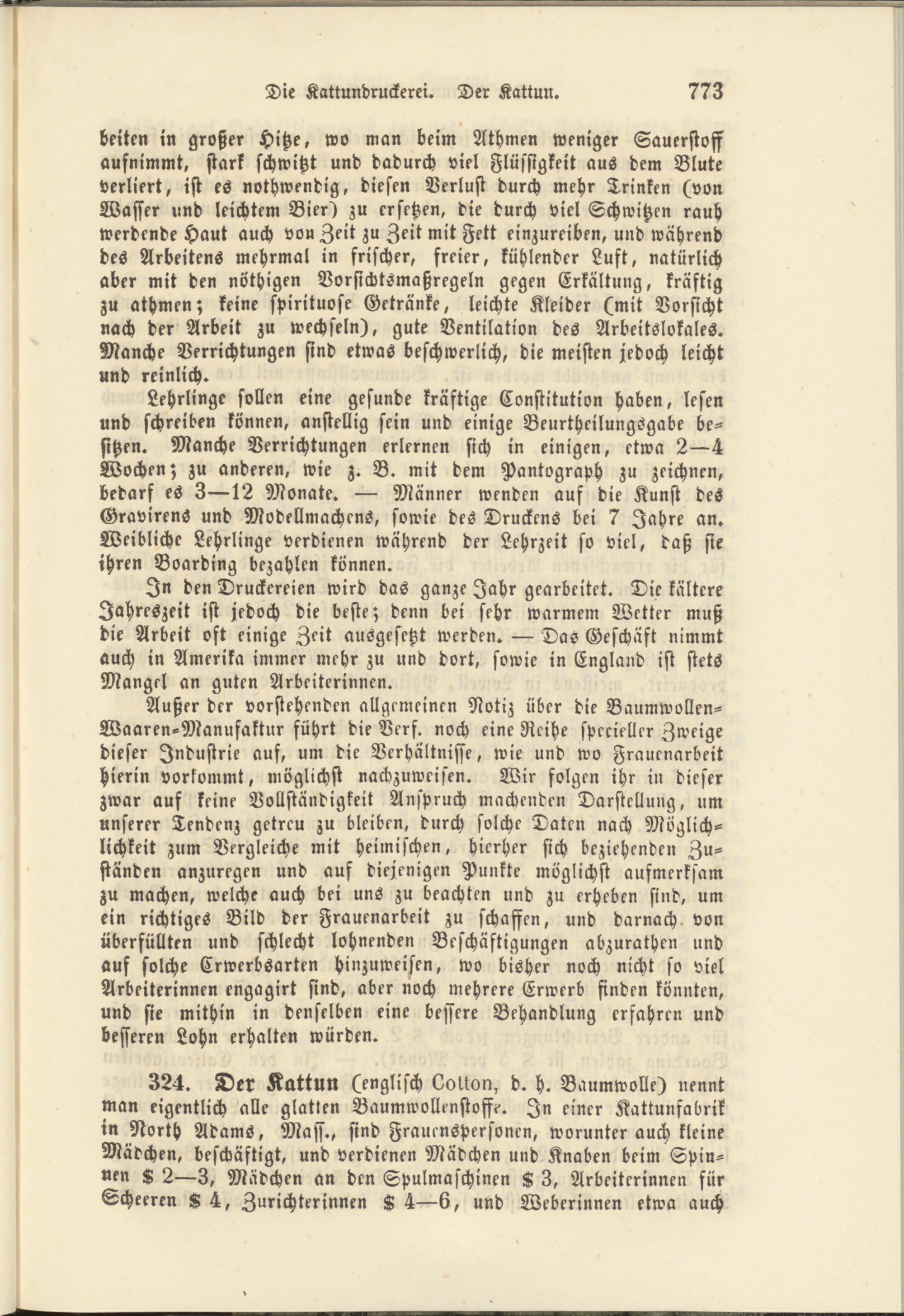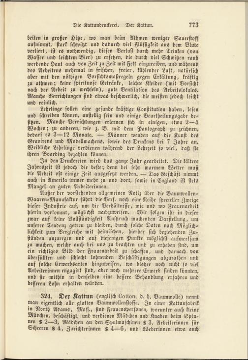 324. Der Kattun (englisch 6olton, d. h. Baumwolle) nennt man eigentlich alle glatten Baumwollenstoffe. In einer Kattunfabrik in North Adams, Mass., sind Frauenspersonen, worunter auch kleine Mädchen, beschäftigt, und verdienen Mädchen und Knaben beim Spinnen K 2—3, Mädchen an den Spülmaschinen S 3, Arbeiterinnen für Scheeren K 4, Zurichterinnen K 4—6, und Weberinnen etwa auch