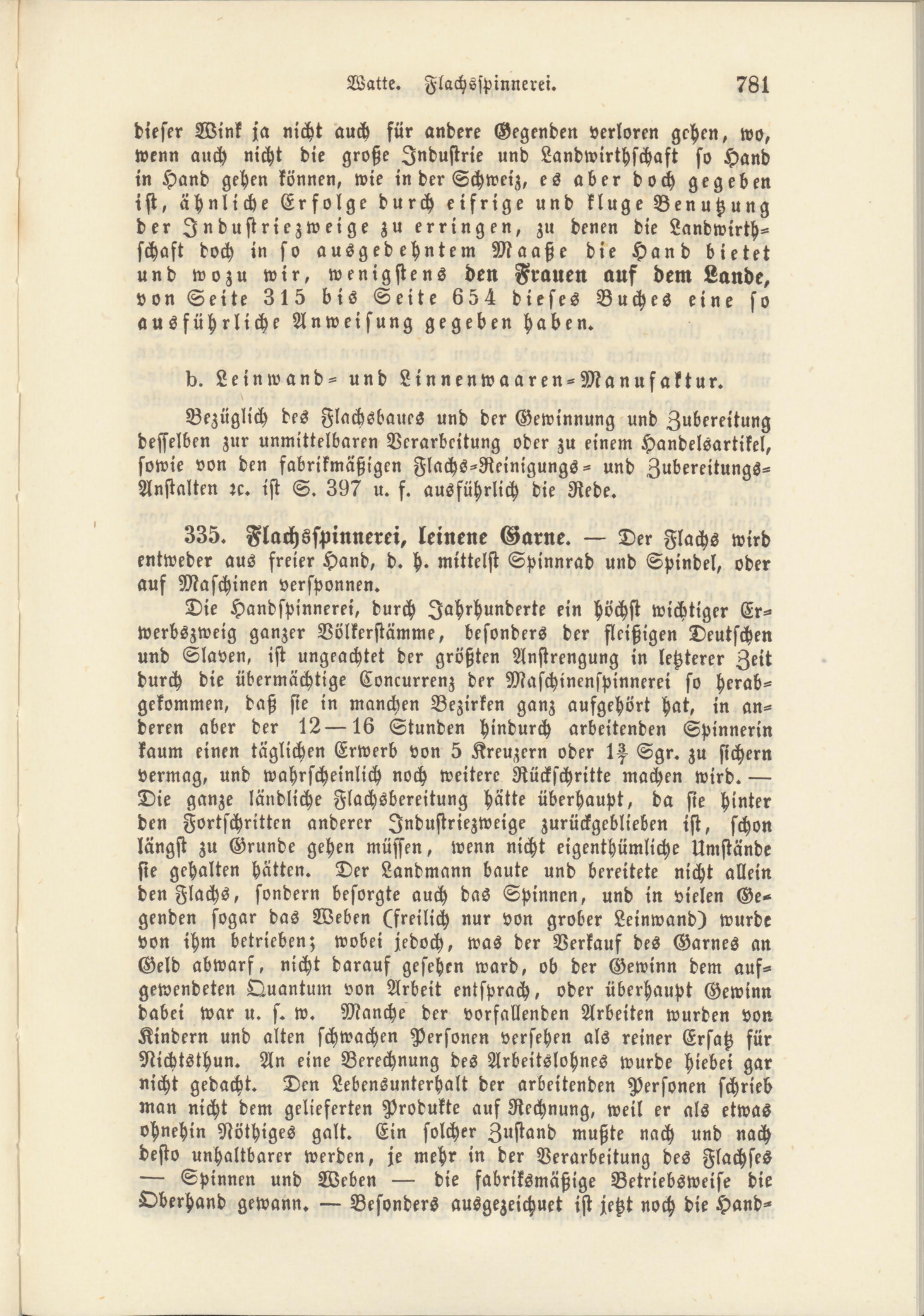 Die Handspinnerei, durch Jahrhunderte ein höchst wichtiger Er­werbszweig ganzer Völkerstämme, besonders der fleißigen Deutschen und Slaven, ist ungeachtet der größten Anstrengung in letzterer Zeit durch die übermächtige Concurrenz der Maschinenspinnerei so herab- gekommen, daß sie in manchen Bezirken ganz aufgehört hat, in an­deren aber der 1216 Stunden hindurch arbeitenden Spinnerin kaum einen täglichen Erwerb von 5 Kreuzern oder 1^ Sgr. zu sichern vermag, und wahrscheinlich noch weitere Rückschritte machen wird. Die ganze ländliche Flachsbereitung hätte überhaupt, da sie hinter den Fortschritten anderer Industriezweige zurückgeblieben ist, schon längst zu Grunde gehen müssen, wenn nicht eigenthümliche Umstände sie gehalten hätten. Der Landmann baute und bereitete nicht allein den Flachs, sondern besorgte auch das Spinnen, und in vielen Ge­genden sogar das Weben (freilich nur von grober Leinwand) wurde von ihm betrieben; wobei jedoch, was der Verkauf des Garnes an Geld abwarf, nicht darauf gesehen ward, ob der Gewinn dem auf­gewendeten Quantum von Arbeit entsprach, oder überhaupt Gewinn dabei war u. s. w. Manche der vorfallenden Arbeiten wurden von Kindern und alten schwachen Personen versehen als reiner Ersatz für Nichtsthun. An eine Berechnung des Arbeitslohnes wurde Hiebei gar nicht gedacht. Den Lebensunterhalt der arbeitenden Personen schrieb man nicht dem gelieferten Produkte auf Rechnung, weil er als etwas ohnehin Nöthiges galt. Ein solcher Zustand mußte nach und nach desto unhaltbarer werden, je mehr in der Verarbeitung des Flachses Spinnen und Weben die fabriksmäßige Betriebsweise die Oberhand gewann. Besonders ausgezeichnet ist jetzt noch die Hand-