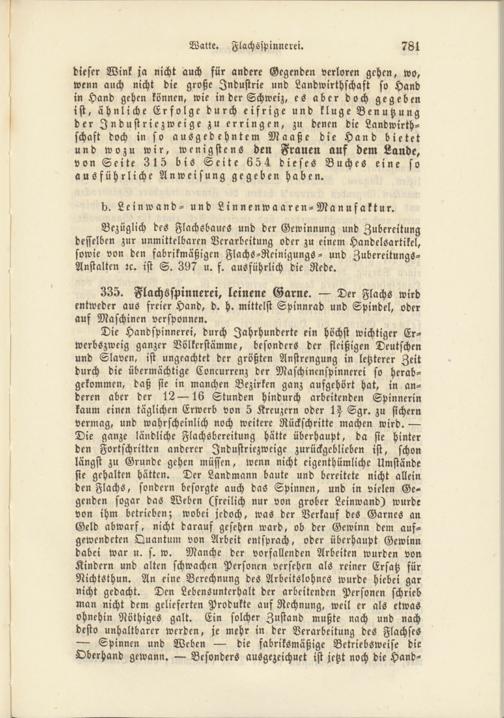 335. Flachsspinnerei, leinene Garne. Der Flachs wird entweder aus freier Hand, d. h. mittelst Spinnrad und Spindel, oder auf Maschinen versponnen.