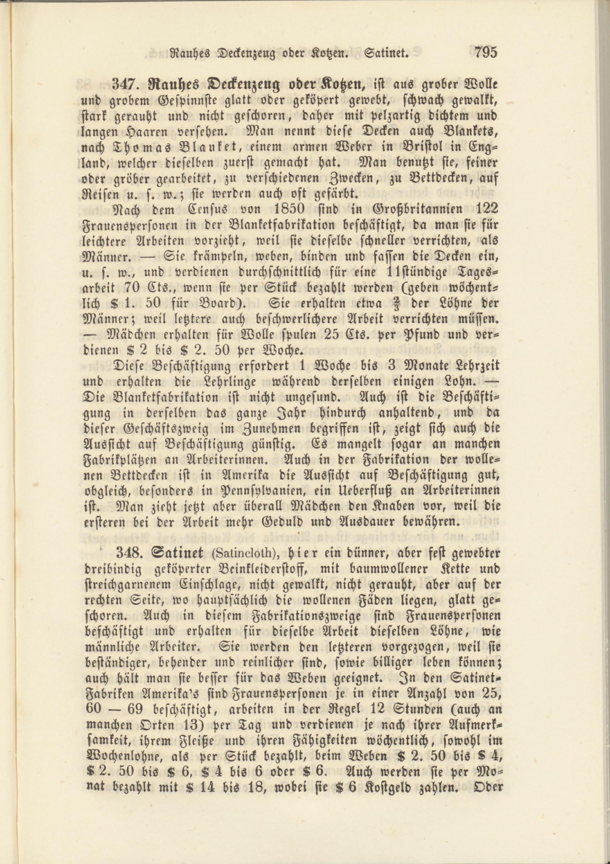 Nach dem Census von 1850 sind in Großbritannien 122 Frauenspersonen in der Blanketfabrikation beschäftigt, da man sie für leichtere Arbeiten vorzieht, weil sie dieselbe schneller verrichten, als Männer. — Sie krämpeln, weben, binden und fasten die Decken ein, u. s. w., und verdienen durchschnittlich für eine 11 ständige Tagcs- arbeit 70 Cts., wenn sie per Stück bezahlt werden (geben wöchentlich K 1. 50 für Board). Sie erhalten etwa H der Löhne der Männer; weil letztere auch beschwerlichere Arbeit verrichten müssen. — Mädchen erhalten für Wolle spulen 25 Cts. per Pfund und verdienen I 2 bis K 2. 50 Per Woche.