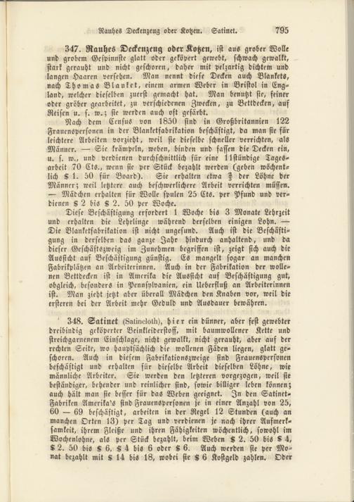 Diese Beschäftigung erfordert 1 Woche bis 3 Monate Lehrzeit und erhalten die Lehrlinge während derselben einigen Lohn. — Die Blanketfabrikation ist nicht ungesund. Auch ist die Beschäftigung in derselben das ganze Jahr hindurch anhaltend, und da dieser Geschäftszweig im Zunehmen begriffen ist, zeigt sich auch die Aussicht auf Beschäftigung günstig. Es mangelt sogar an manchen Fabrikplätzen an Arbeiterinnen. Auch in der Fabrikation der wollenen Bettdecken ist in Amerika die Aussicht auf Beschäftigung gut, obgleich, besonders in Pennsylvanien, ein Ueberfluß an Arbeiterinnen ist. Man zieht jetzt aber überall Mädchen den Knaben vor, weil die ersteren bei der Arbeit mehr Geduld und Ausdauer bewähren.