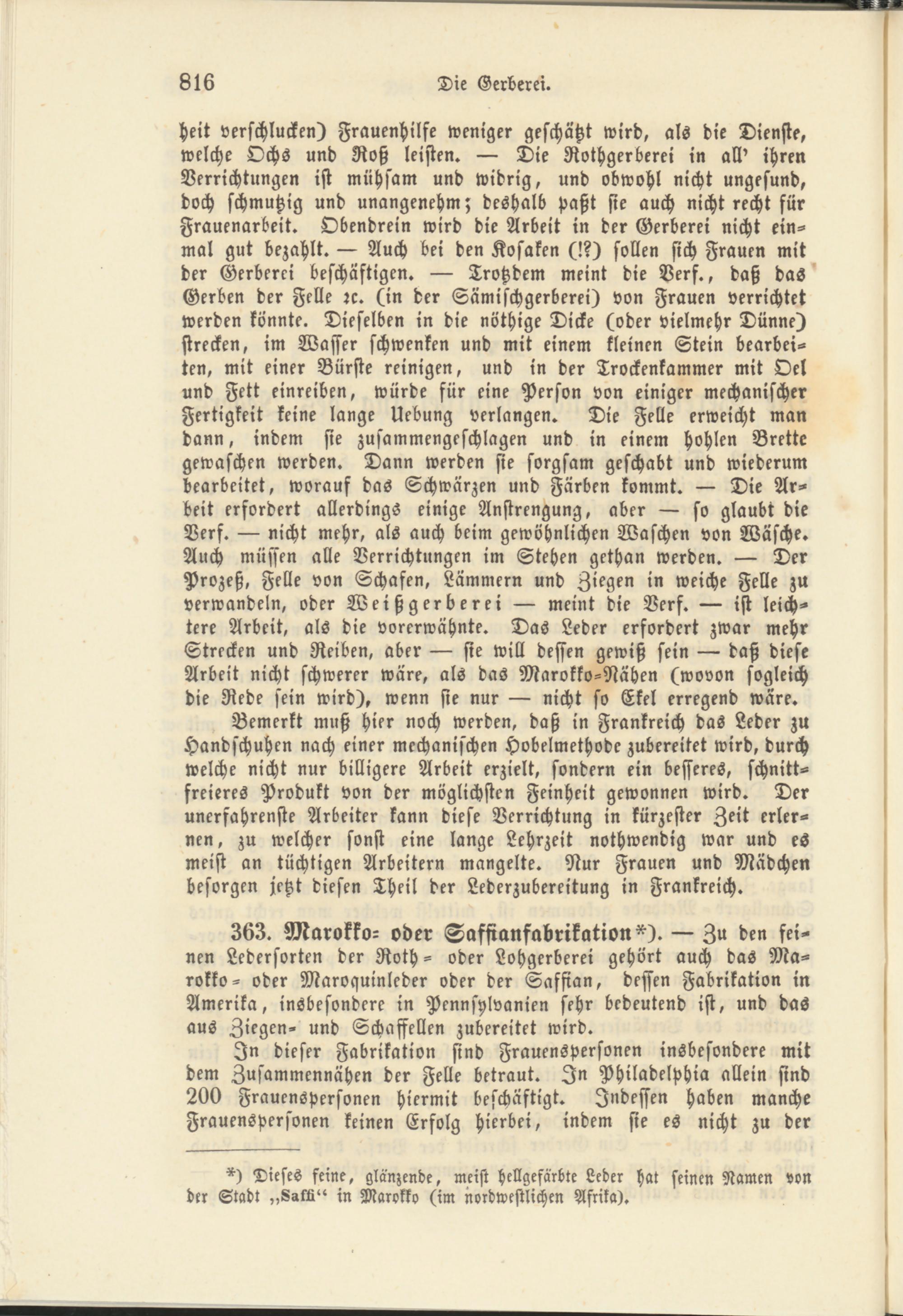 363. Marokko- oder Saffianfabrikation*). — Zu den feinen Ledersorten der Roth- oder Lohgerberei gehört auch das Marokko- oder Maroquinleder oder der Saffian, dessen Fabrikation in Amerika, insbesondere in Pennsylvanien sehr bedeutend ist, und das aus Ziegen- und Schaffellen zubereitet wird.