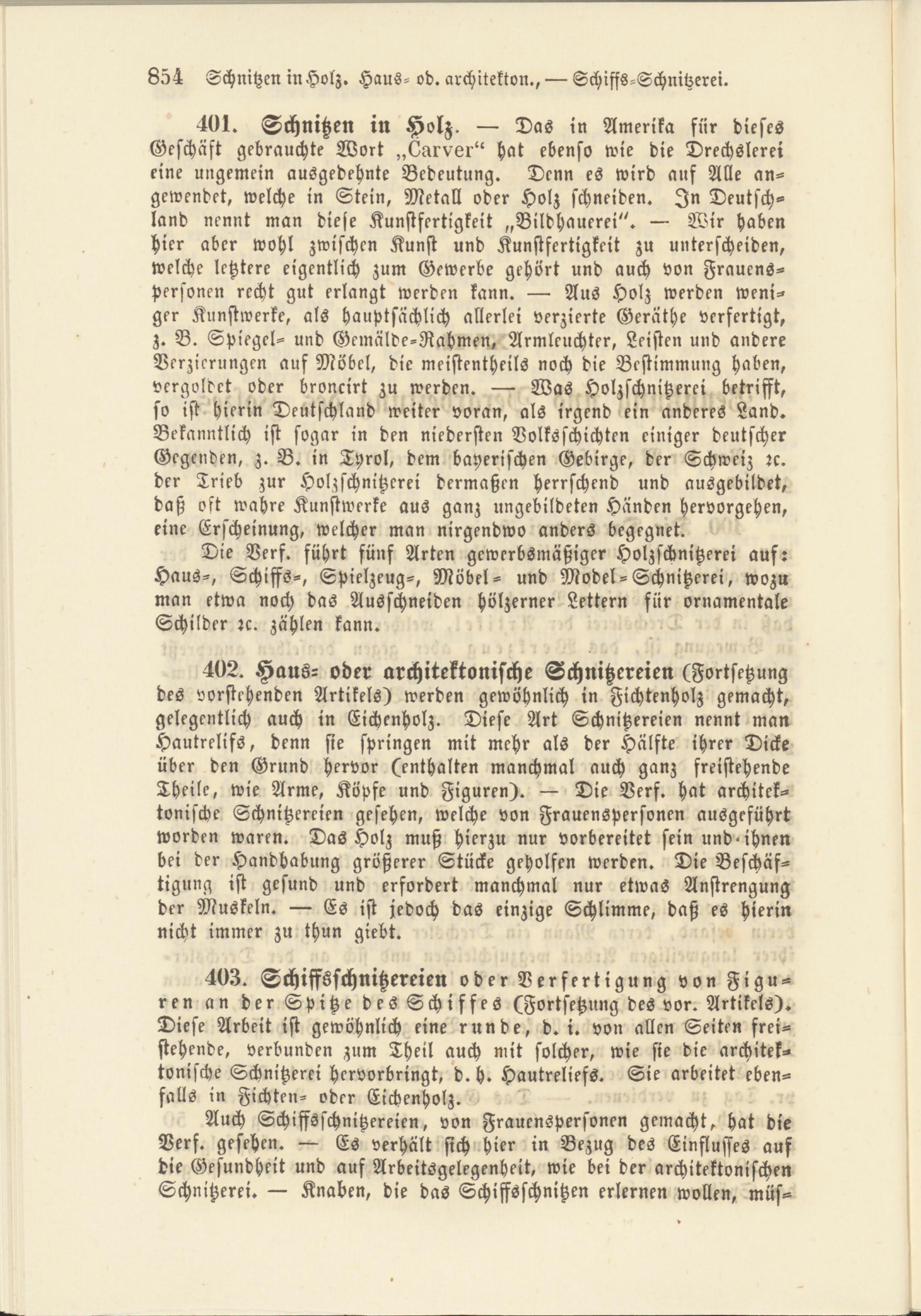 403. Schiffsschnitzereien oder Verfertigung von Figuren an der Spitze des Schiffes (Fortsetzung des vor. Artikels). Diese Arbeit ist gewöhnlich eine runde, d. i. von allen Seiten freistehende, verbunden zum Theil auch mit solcher, wie sie die architektonische Schnitzerei hervorbringt, d.h. Hautreliefs. Sie arbeitet ebenfalls in Fichten- oder Eichenholz.