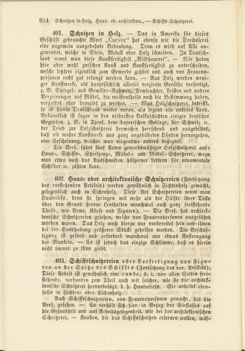 Die Verf. führt fünf Arten gewerbsmäßiger Holzschnitzerei auf: Haus-, Schiffs-, Spielzeug-, Möbel- und Model-Schnitzerei, wozu man etwa noch das Ausschneiden hölzerner Lettern für ornamentale Schilder rc. zählen kann.