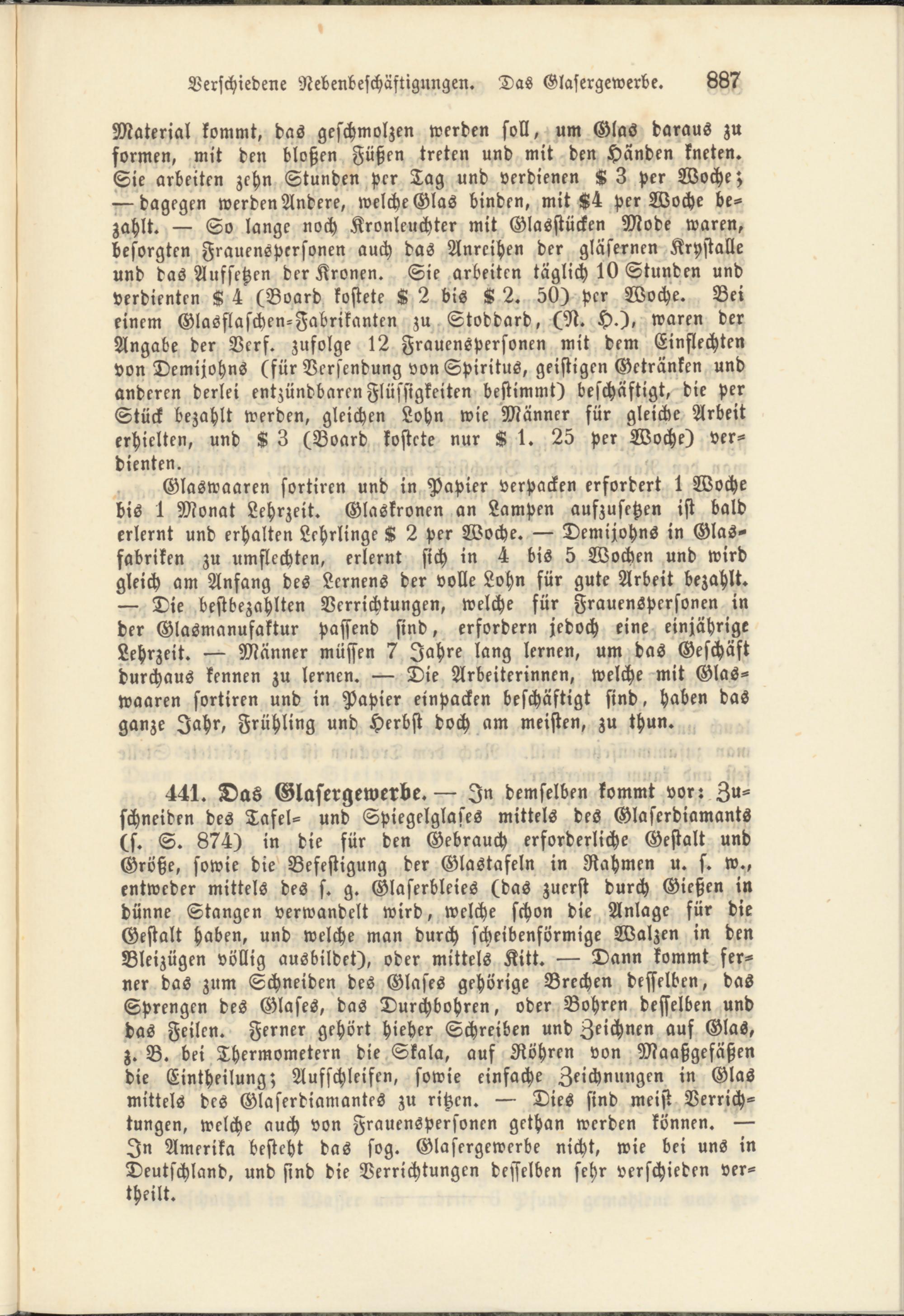 — Die bestbezahlten Verrichtungen, welche für Frauenspersonen in der Glasmanufaktur passend sind, erfordern jedoch eine einjährige Lehrzeit. — Männer müssen 7 Jahre lang lernen, um das Geschäft durchaus kennen zu lernen. — Die Arbeiterinnen, welche mit Glaswaaren sortiren und in Papier einpacken beschäftigt sind, haben das ganze Jahr, Frühling und Herbst doch am meisten, zu thun.