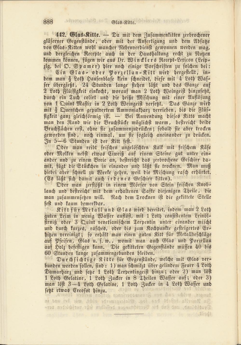 442. Glas-Kitte. — Da mit dem Zusammenkitten zerbrochener gläserner Gegenstände, oder mit der Anfertigung und dem Absätze von Glas-Kitten wohl mancher Nebenverdienst gewonnen werden mag, und dergleichen Recepte auch in der Haushaltung recht zu Nutzen kommen können, fügen wir aus Dr. Wincklers Recept-Lexicon (Leipzig, bei O. Spamer) hier noch einige Vorschriften zu solchen bei: