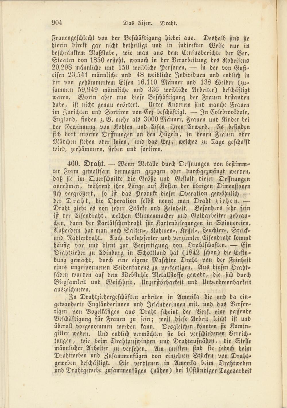 Frauengeschlecht von der Beschäftigung Hiebei aus. Deshalb sind sie hierin direkt gar nicht betheiligt und in indirekter Weise nur in beschränktem Maßstabe, wie man aus dem Censusberichte der Ver. Staaten von 1850 ersieht, wonach in der Verarbeitung des Roheisens 20,298 männliche und 150 weibliche Personen, — in der von Gußeisen 23,541 männliche und 48 weibliche Individuen und endlich in der von gehämmertem Eisen 16,110 Männer und 138 Weiber (zusammen 59,949 männliche und 336 weibliche Arbeiter) beschäftigt waren. Worin aber nun diese Beschäftigung der Frauen bestanden habe, ist nicht genau erörtert. Unter Anderem sind manche Frauen im Zurichten und Sortiren von Erz beschäftigt. — Zn Colebrookdale, England, finden z. B. mehr als 3000 Männer, Frauen und Kinder bei der Gewinnung von Kohlen und Eisen ihren Erwerb. Es befinden sich dort enorme Oeffnungen an den Hügeln, in denen Frauen oder Mädchen stehen oder knien, und das Erz, welches zu Tage geschafft wird, zerhämmern, sieben und sortiren.