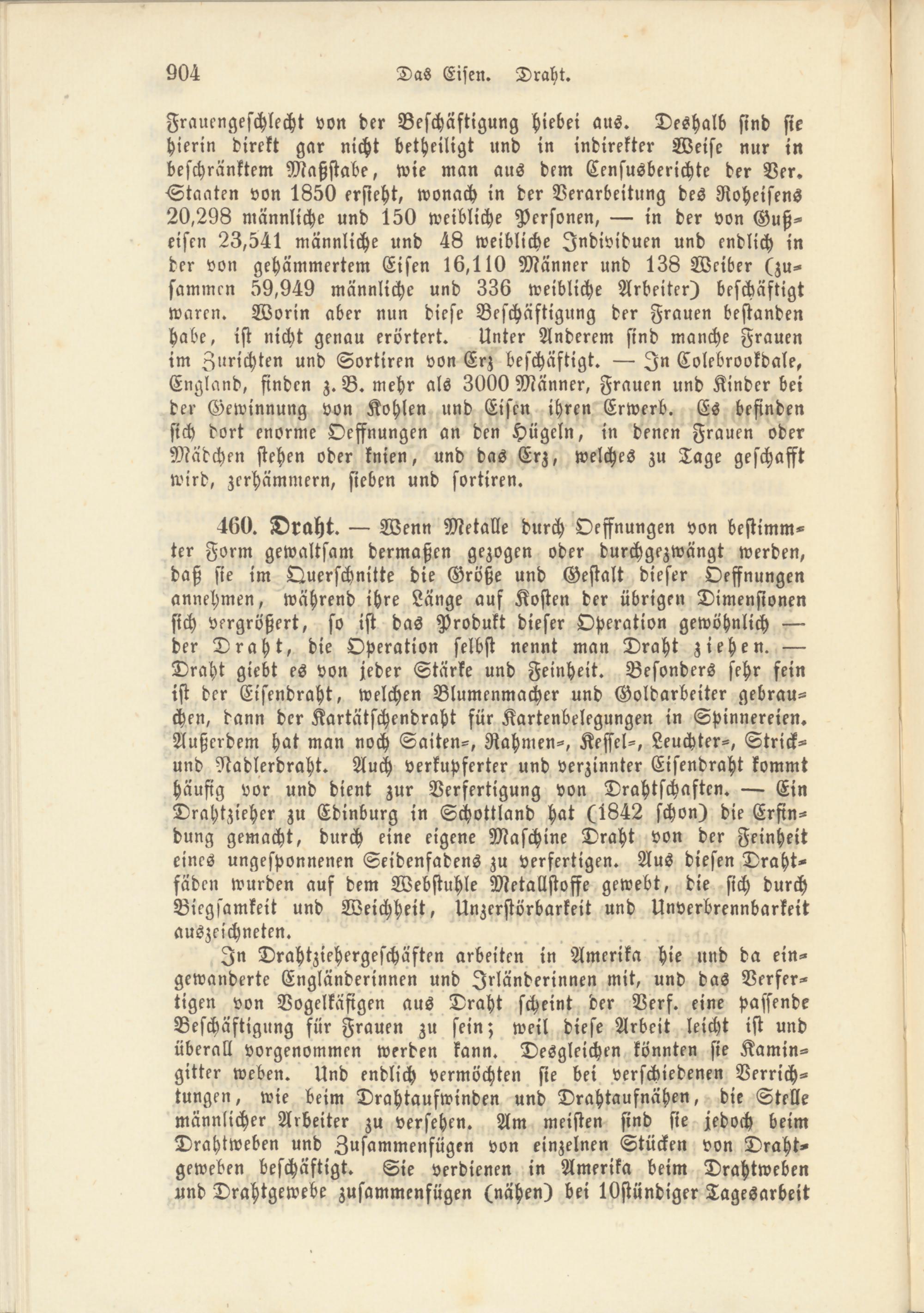 In Drahtziehergeschäften arbeiten in Amerika hie und da ein- gewanderte Engländerinnen und Irländerinnen mit, und das Verfertigen von Vogelkäfigen aus Draht scheint der Verf. eine passende Beschäftigung für Frauen zu sein; weil diese Arbeit leicht ist und überall vorgenommen werden kann. Desgleichen könnten sie Kamingitter weben. Und endlich vermöchten sie bei verschiedenen Verrichtungen, wie beim Drahtaufwinden und Drahtaufnähen, die Stelle männlicher Arbeiter zu versehen. Am meisten sind sie jedoch beim Drahtweben und Zusammenfügen von einzelnen Stücken von Drahtgeweben beschäftigt. Sie verdienen in Amerika beim Drahtweben und Drahtgewebe zusammenfügen (nähen) bei lOstündiger Tagesarbeit