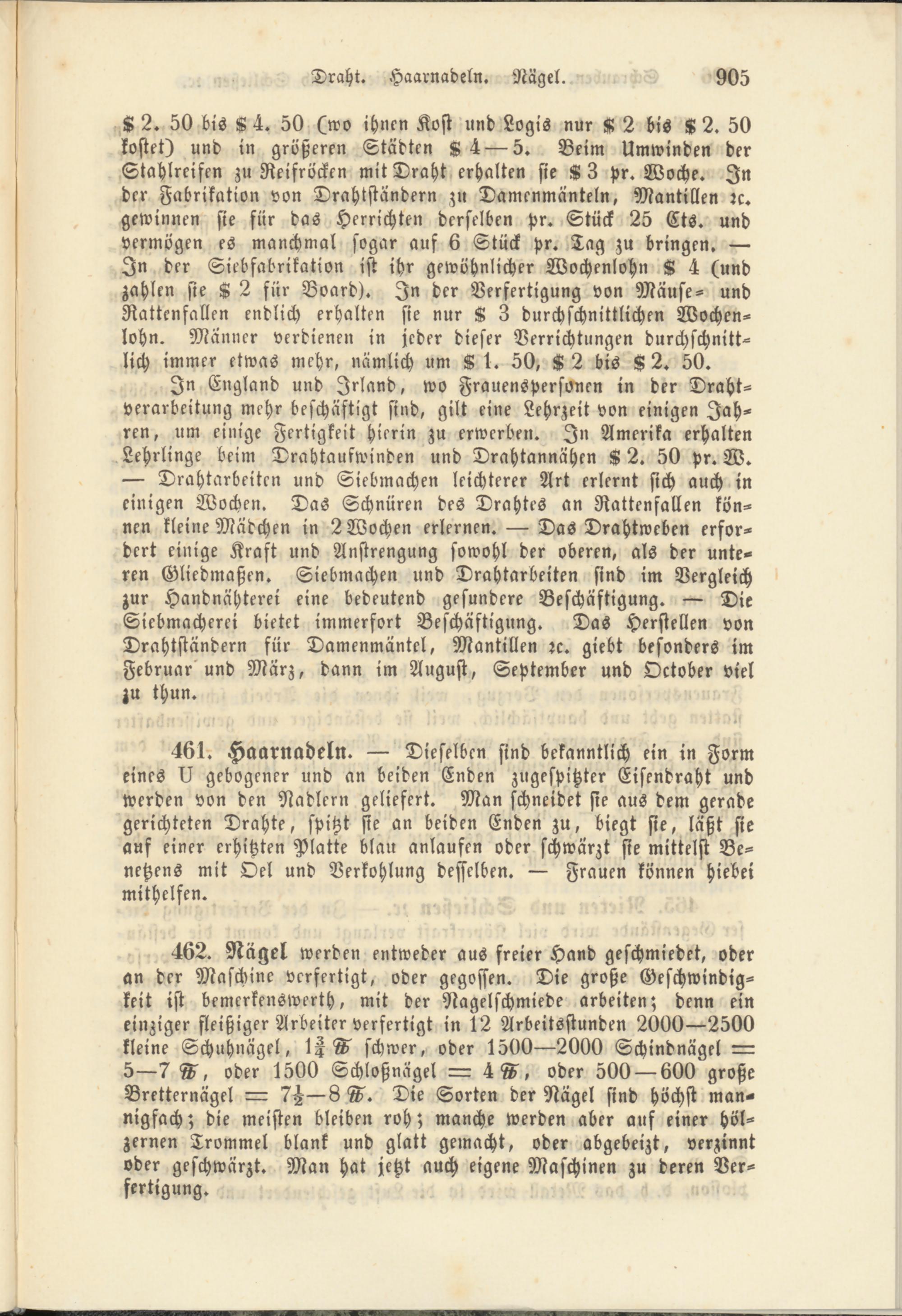 K 2. 50 bis K 4. 50 (wo ihnen Kost und Logis nur K 2 bis K 2. 50 kostet) und in größeren Städten K 4— 5. Beim Umwinden der Stahlreifen zu Reifröcken mit Draht erhalten sie K3 pr. Woche. In der Fabrikation von Drahtständern zu Damenmänteln, Mantillen rc. gewinnen sie für das Herrichten derselben pr. Stück 25 Cts. und vermögen es manchmal sogar auf 6 Stück pr. Tag zu bringen. — In der Siebfabrikation ist ihr gewöhnlicher Wochenlohn K 4 (und zahlen sie K 2 für Board). In der Verfertigung von Mäuse- und Rattenfallen endlich erhalten sie nur K 3 durchschnittlichen Wochenlohn. Männer verdienen in jeder dieser Verrichtungen durchschnittlich immer etwas mehr, nämlich um K 1. 50, K 2 bis K 2. 50.