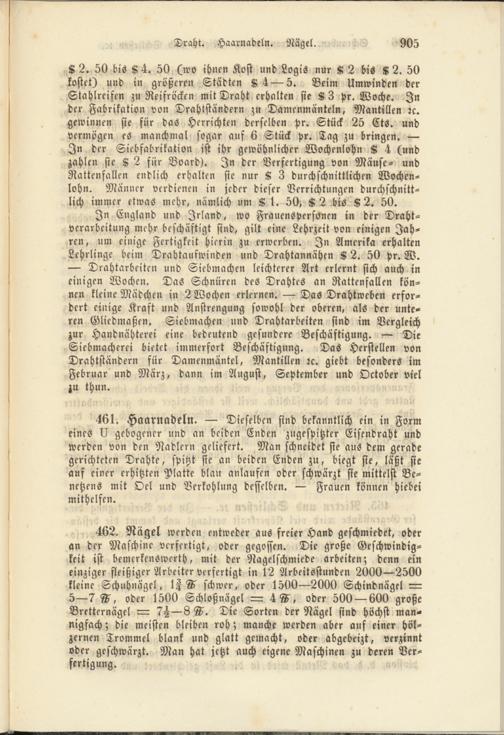 461. Haarnadeln. — Dieselben sind bekanntlich ein in Form eines II gebogener und an beiden Enden zugespitzter Eisendraht und werden von den Radiern geliefert. Man schneidet sie aus dem gerade gerichteten Drahte, spitzt sie an beiden Enden zu, biegt sie, läßt sie auf einer erhitzten Platte blau anlaufen oder schwärzt sie mittelst Be- netzens mit Oel und Verkohlung desselben. — Frauen können Hiebei mithelfen.