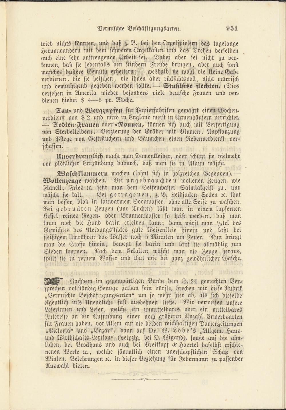 Nachdem im gegenwärtigen Bande dem S. 24 gemachten Versprechen vollständig Genüge gethan sein dürfte, brechen wir diese Rubrik „Vermischte Beschäftigungsarten" um so mehr hier ab, als sich dieselbe eigentlich in's Unendliche fast ausdehnen ließe. Wir verweisen unsere Leserinnen und Leser, welche ein unmittelbares oder ein mittelbares Interesse an der Auffindung einer noch größeren Anzahl Erwerbsarten für Frauen haben, vor Allem auf die beiden reichhaltigen Damenzeitungen „Victoria" und „Bazar", dann auf l)r. W. Löbe's „Allgem. Hausund Wirthschafts-Lexikon" (Leipzig, bei O. Wigand), sowie auf die ähnlichen, bei Brockhaus und auch bei Breitkops ck Haertel dafelbst erschienenen Werke rc., welche sämmtlich einen unerschöpflichen Schatz von Winken, Belehrungen rc. in dieser Beziehung für Jedermann zu passender Auswahl bieten.