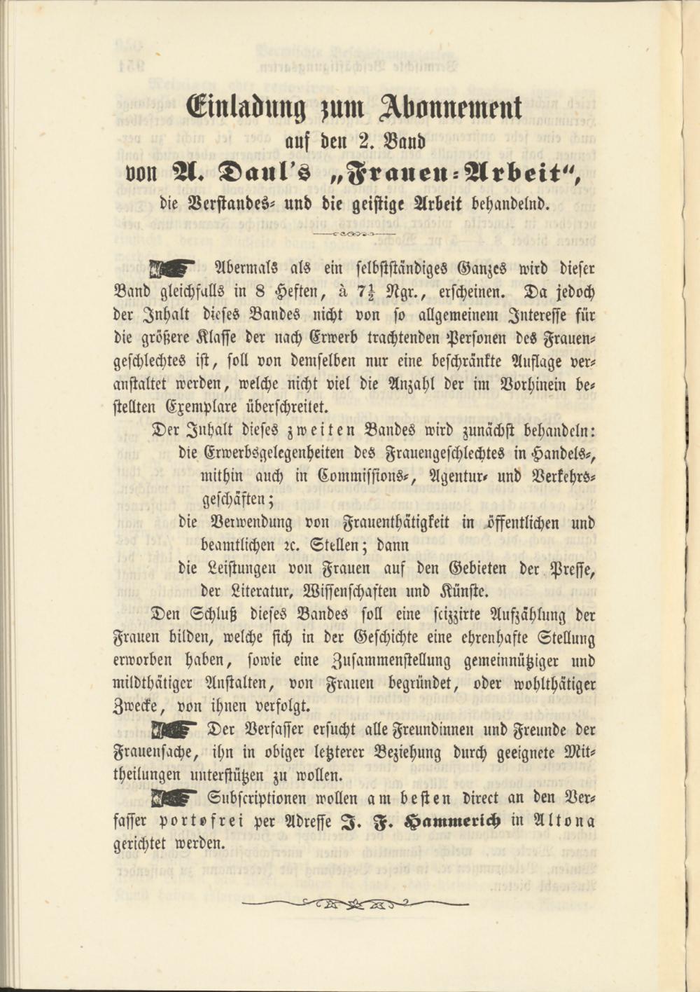 Abermals als ein selbständiges Ganzes wird dieser Band gleichfalls in 8 Heften, a 7^ Ngr., erscheinen. Da jedoch der Inhalt dieses Bandes nicht von so allgemeinem Interesse für die größere Klasse der nach Erwerb trachtenden Personen des Frauen- geschlechtes ist, soll von demselben nur eine beschränkte Auflage veranstaltet werden, welche nicht viel die Anzahl der im Vorhinein bestellten Exemplare überschreitet.
