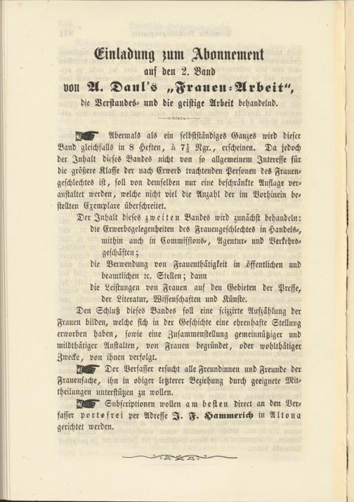 Der Verfasser ersucht alle Freundinnen und Freunde der Frauensache, ihn in obiger letzterer Beziehung durch geeignete Mittheilungen unterstützen zu wollen.