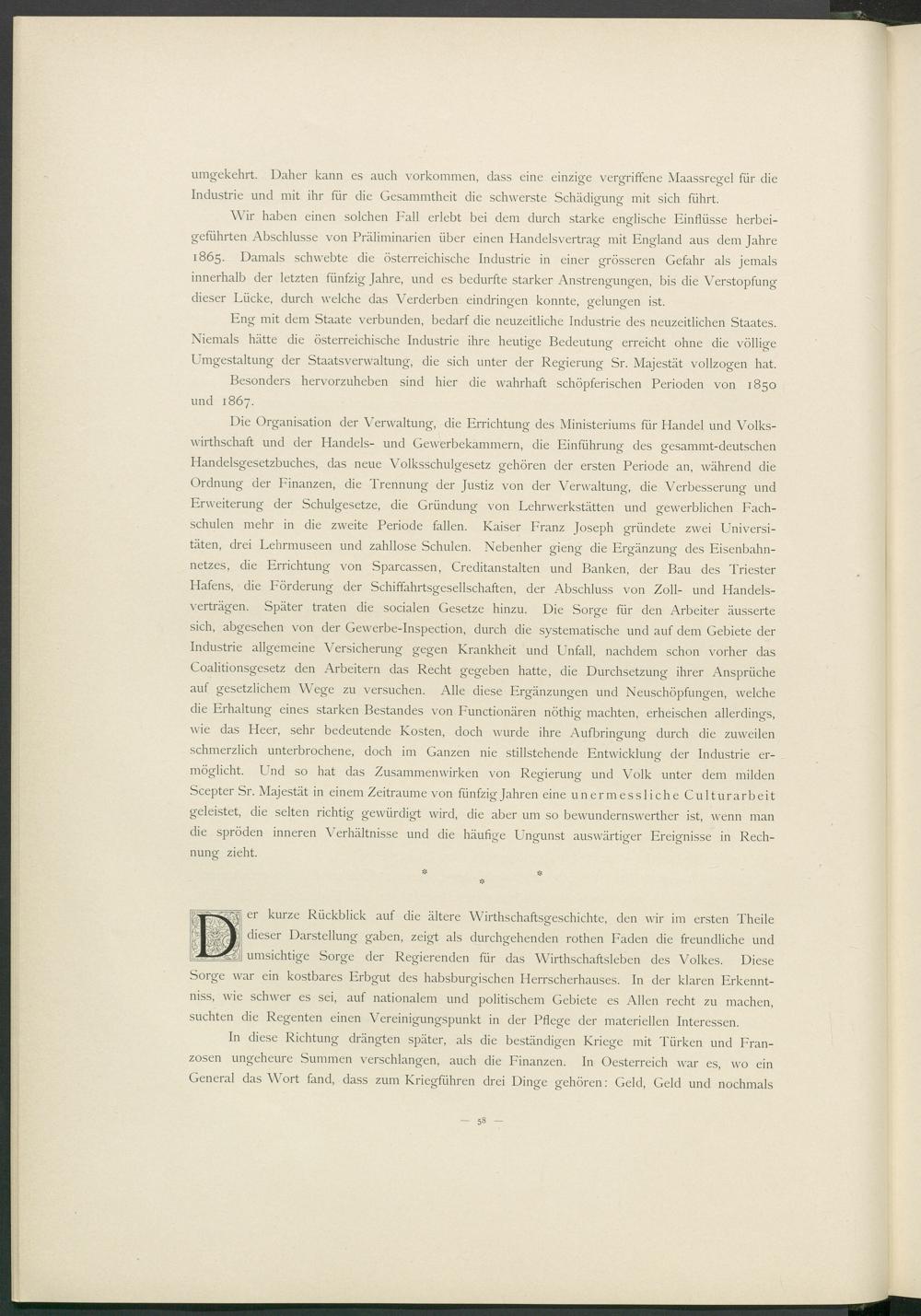 Eng mit dem Staate verbunden, bedarf die neuzeitliche Industrie des neuzeitlichen Staates. Niemals hätte die österreichische Industrie ihre heutige Bedeutung erreicht ohne die völlige Umgestaltung der Staatsverwaltung, die sich unter der Regierung Sr. Majestät vollzogen hat.