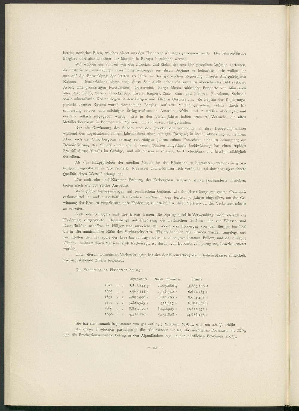 Als das Hauptproduct der unedlen Metalle ist das Eisenerz zu betrachten, welches in gross­artigen Lagerstätten in Steiermark, Kärnten und Böhmen sich vorfindet und durch ausgezeichnete Qualität einen Weltruf erlangt hat.