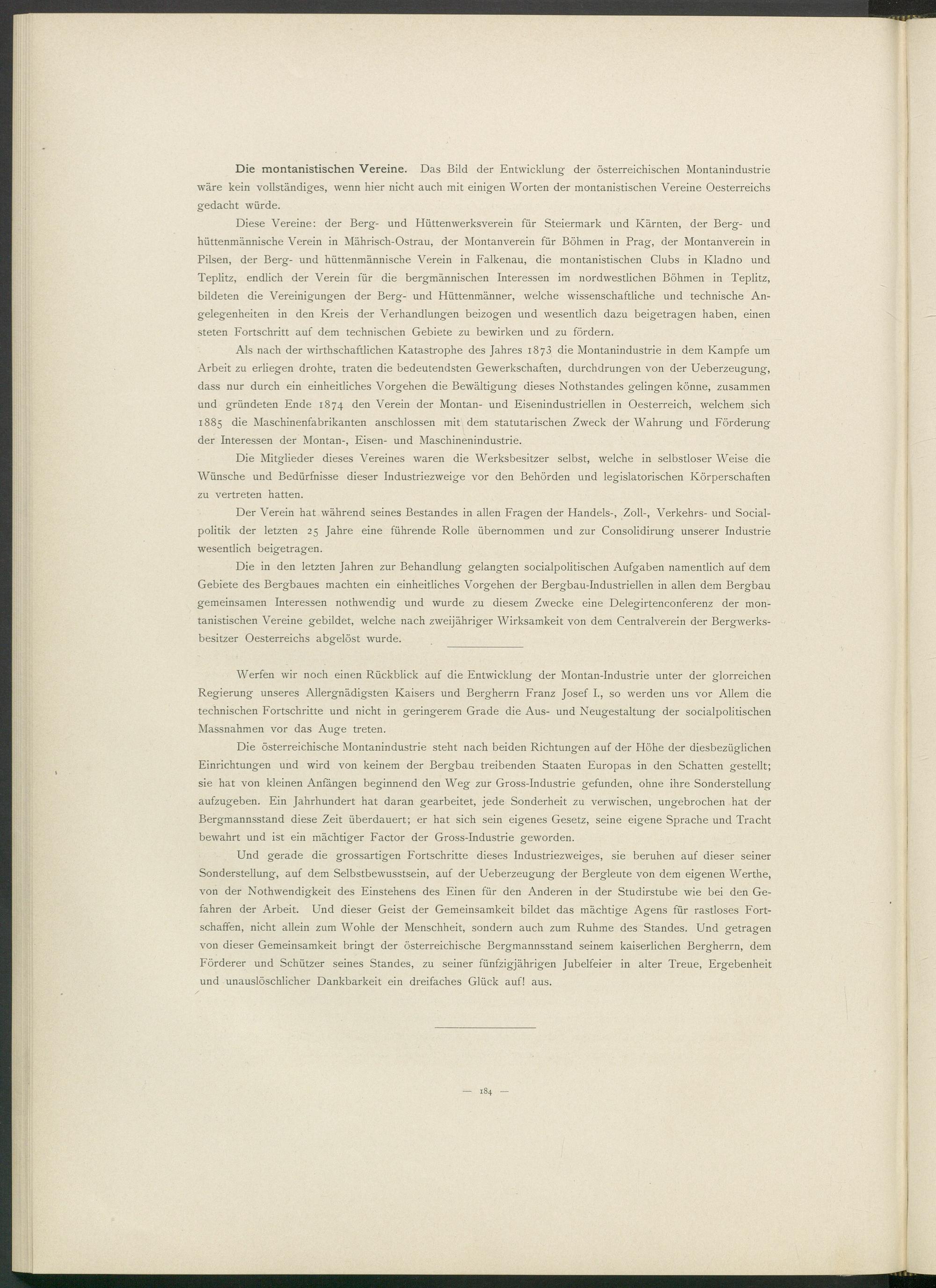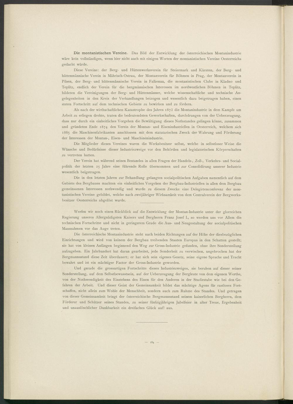 Diese Vereine: der Berg- und Hüttenwerksverein für Steiermark und Kärnten, der Berg- und hüttenmännische Verein in Mährisch-Ostrau, der Montanverein für Böhmen in Prag, der Montanverein in Pilsen, der Berg- und hüttenmännische Verein in Falkenau, die montanistischen Clubs in Kladno und Teplitz, endlich der Verein für die bergmännischen Interessen im nordwestlichen Böhmen in Teplitz, bildeten die Vereinigungen der Berg- und Hüttenmänner, welche wissenschaftliche und technische Angelegenheiten in den Kreis der Verhandlungen beizogen und wesentlich dazu beigetragen haben, einen steten Fortschritt auf dem technischen Gebiete zu bewirken und zu fördern.