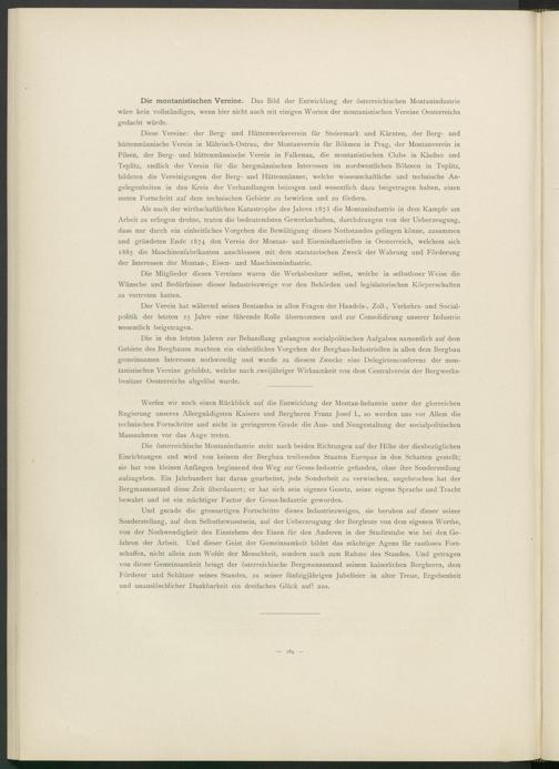 Werfen wir noch einen Rückblick auf die Entwicklung der Montan-Industrie unter der glorreichen Regierung unseres Allergnädigsten Kaisers und Bergherrn Franz Josef I., so werden uns vor Allem die technischen Fortschritte und nicht in geringerem Grade die Aus- und Neugestaltung der socialpolitischen Massnahmen vor das Auge treten.