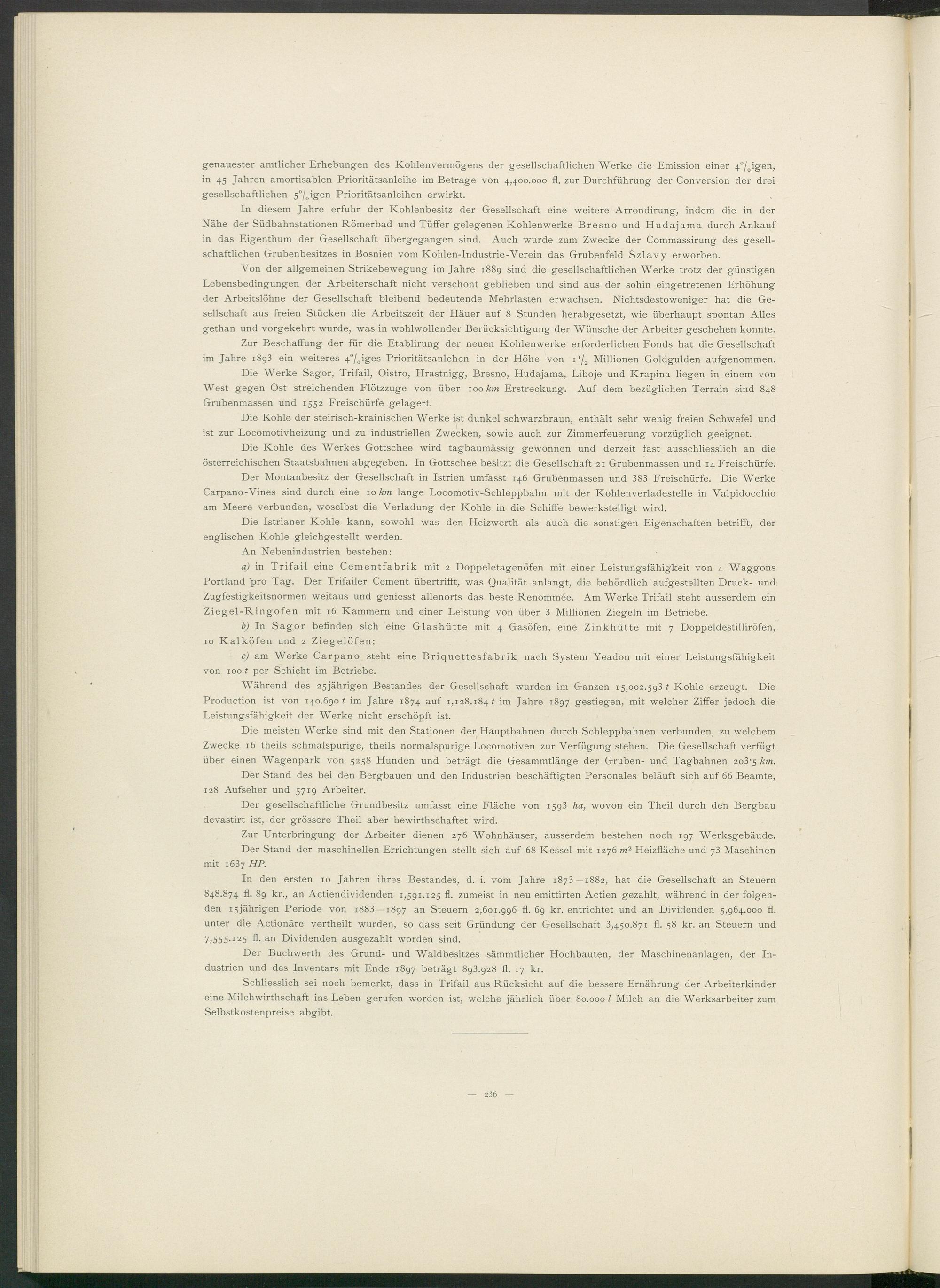 In diesem Jahre erfuhr der Kohlenbesitz der Gesellschaft eine weitere Arrondirung, indem die in der Nähe der Südbahnstationen Römerbad und Tüffer gelegenen Kohlenwerke Bresno und Hudajama durch Ankauf in das Eigenthum der Gesellschaft übergegangen sind. Auch wurde zum Zwecke der Commassirung des gesellschaftlichen Grubenbesitzes in Bosnien vom Kohlen-Industrie-Verein das Grubenfeld Szlavy erworben.
