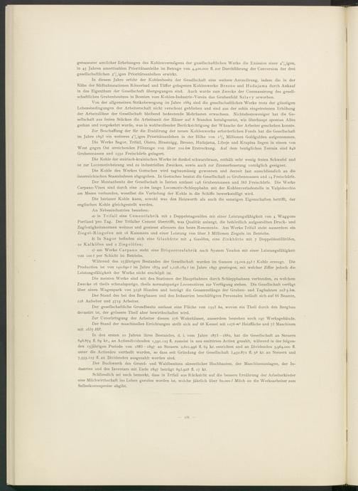 Während des 25jährigen Bestandes der Gesellschaft wurden im Ganzen 15,002.593? Kohle erzeugt. Die Production ist von 140.690? im Jahre 1874 au f 1,128.184? i m Jahre 1897 gestiegen, mit welcher Ziffer jedoch die Leistungsfähigkeit der Werke nicht erschöpft ist.